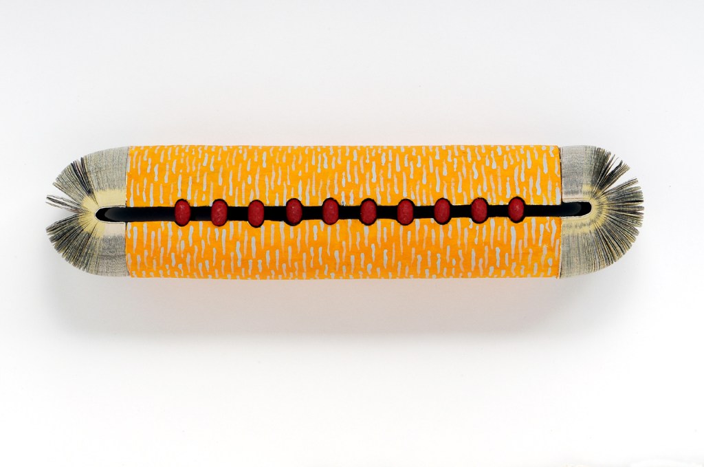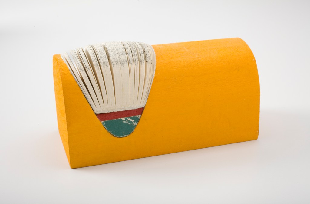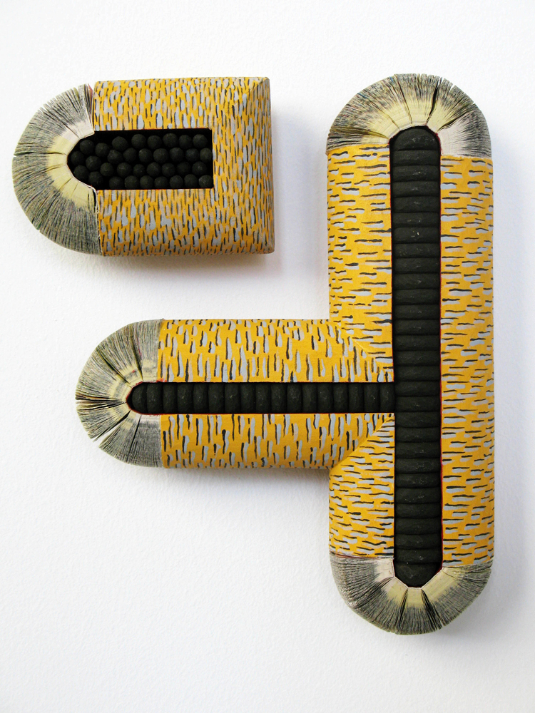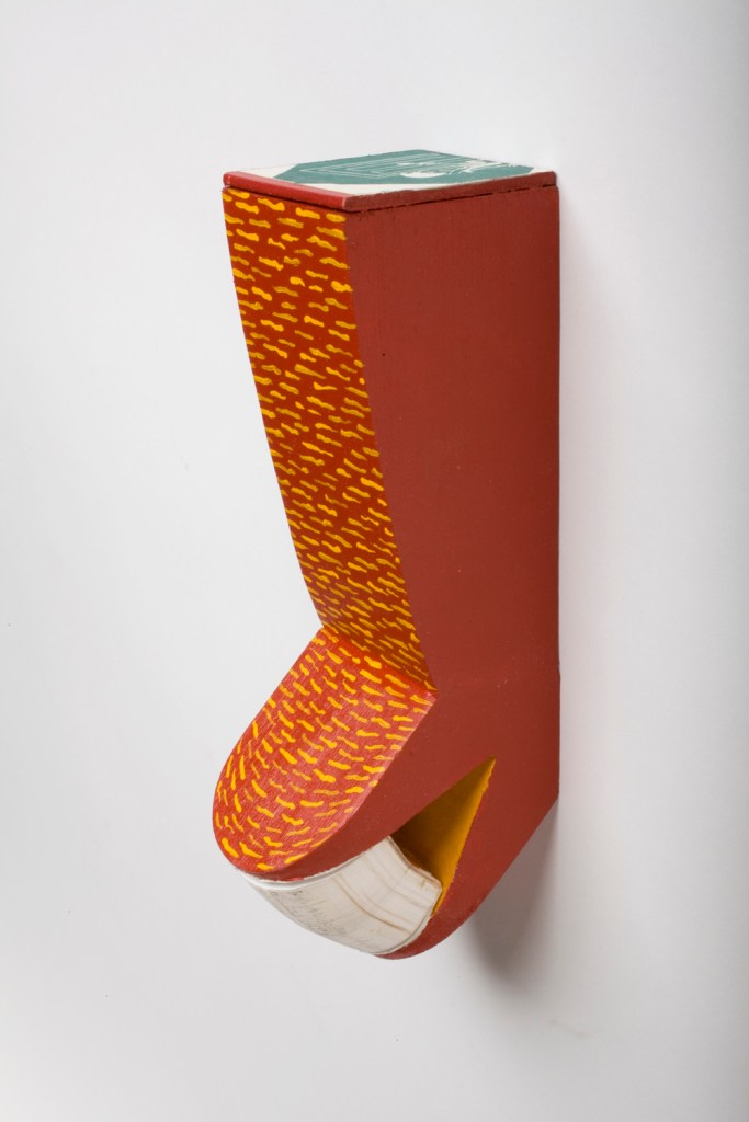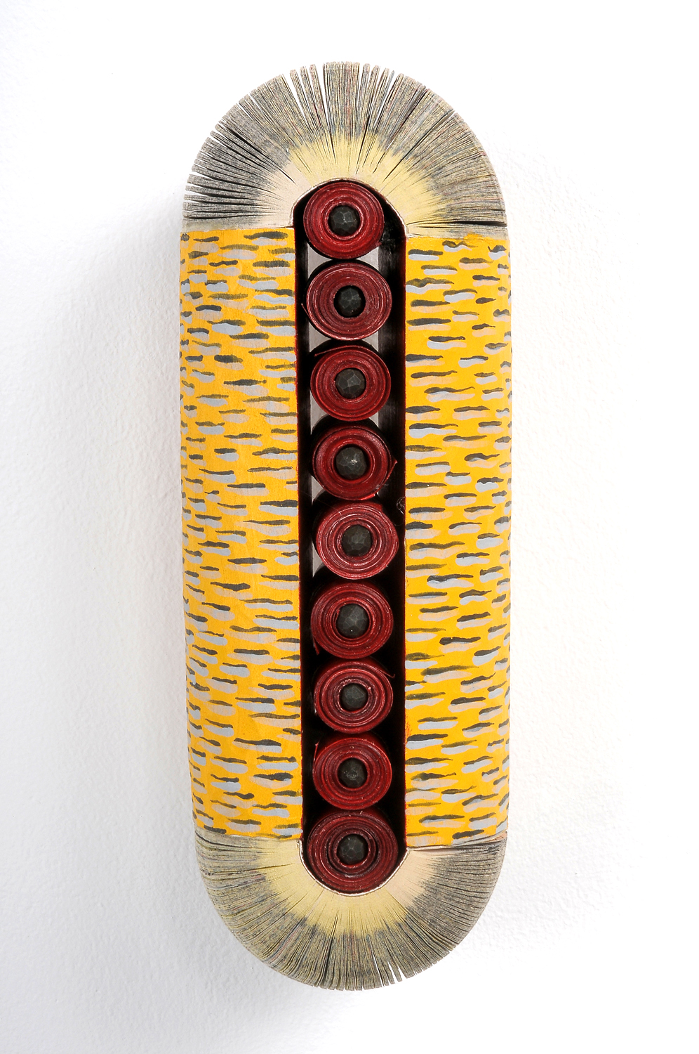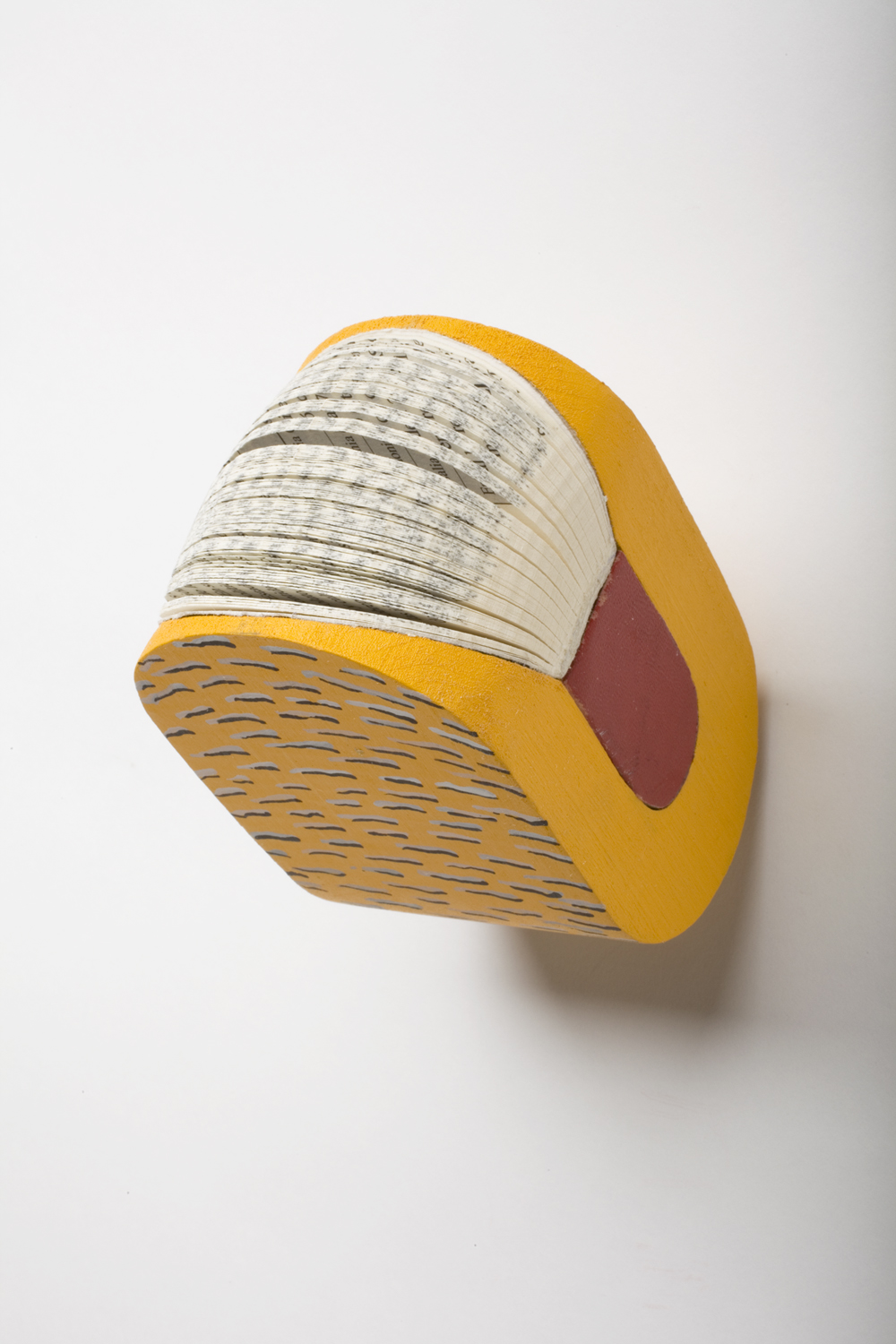 Straus has integrated the Boston Yellow Pages and computer manuals, cut and splayed into hemispheres, with her carved and painted wood forms. This adds an unexpected soft and flexible element that contributes to a playfulness in the work.
