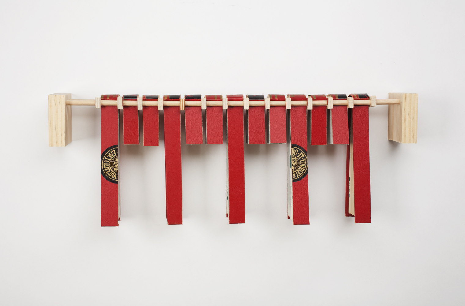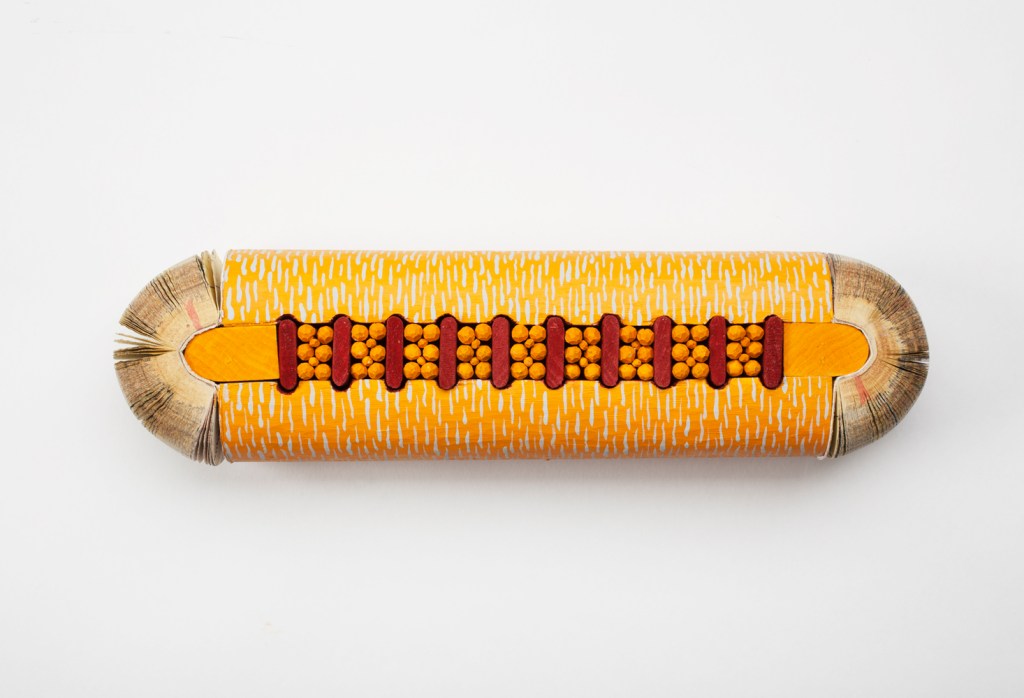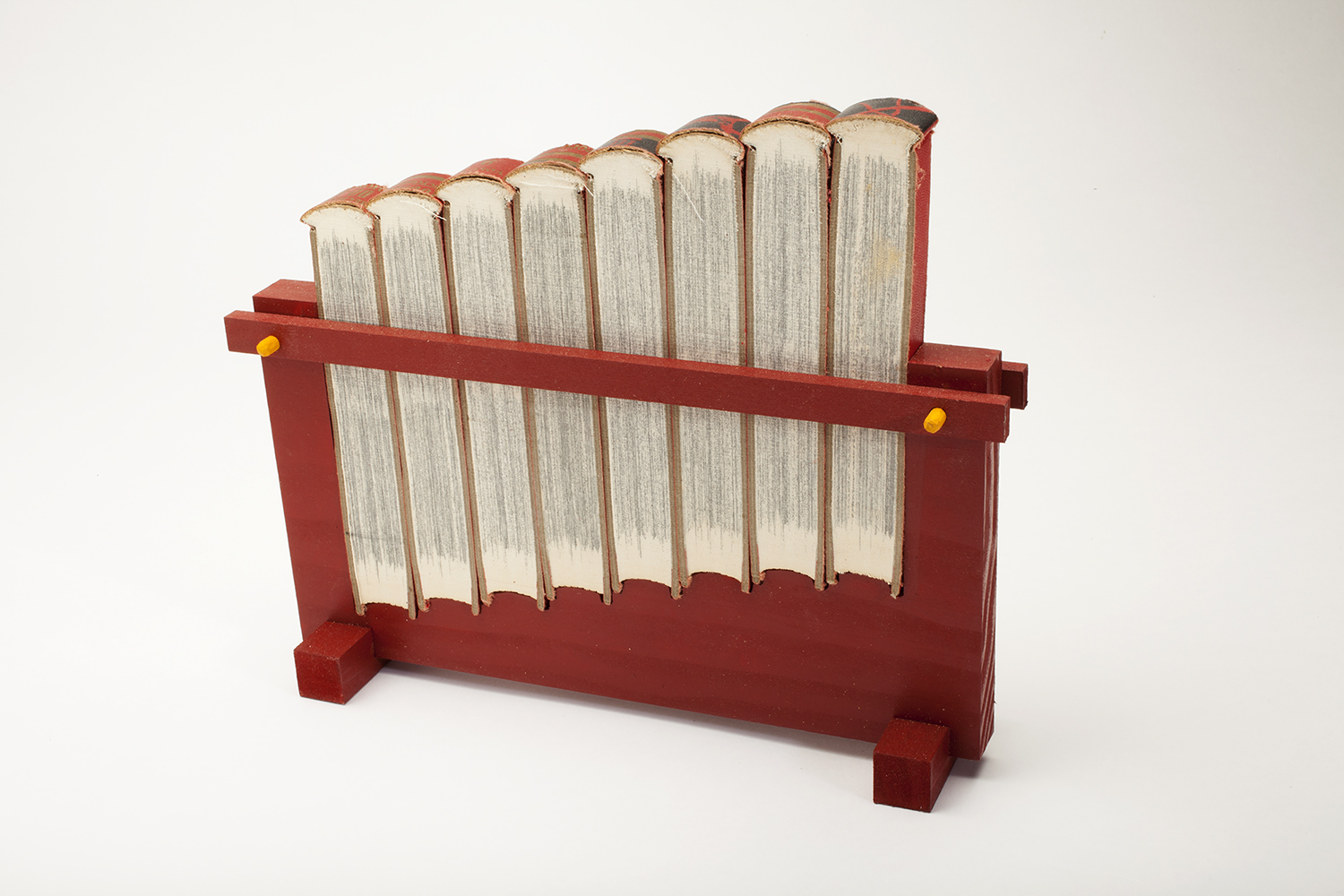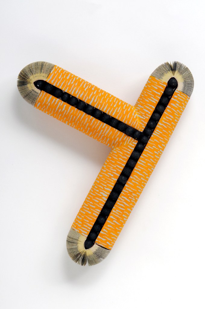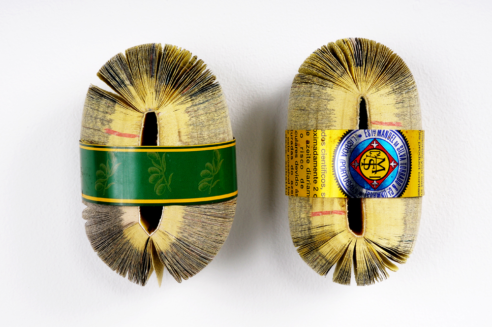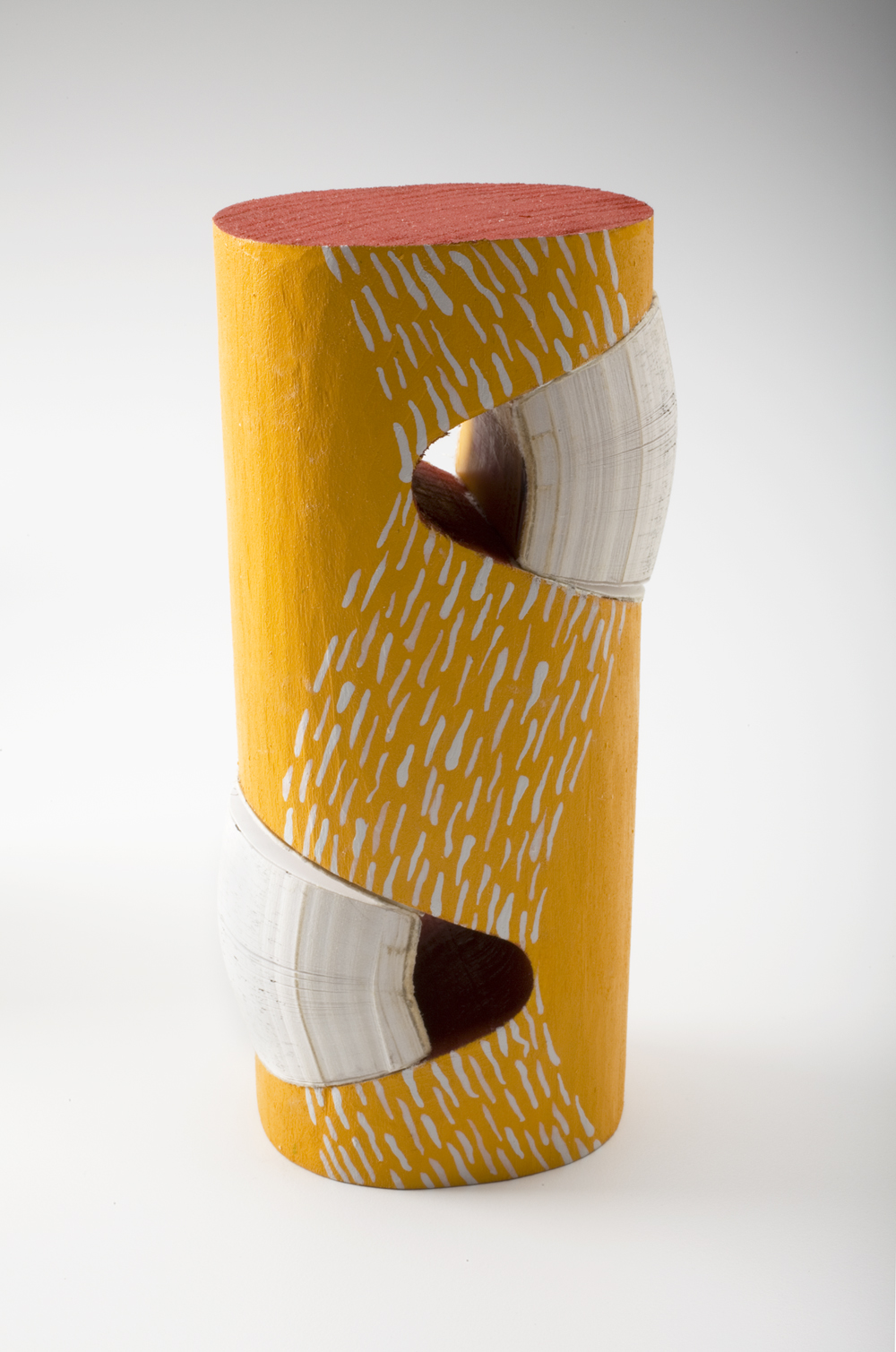 Straus has integrated the Boston Yellow Pages and computer manuals, cut and splayed into hemispheres, with her carved and painted wood forms. This adds an unexpected soft and flexible element that contributes to a playfulness in the work.