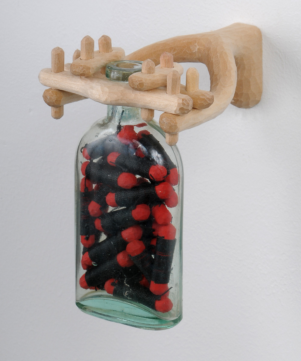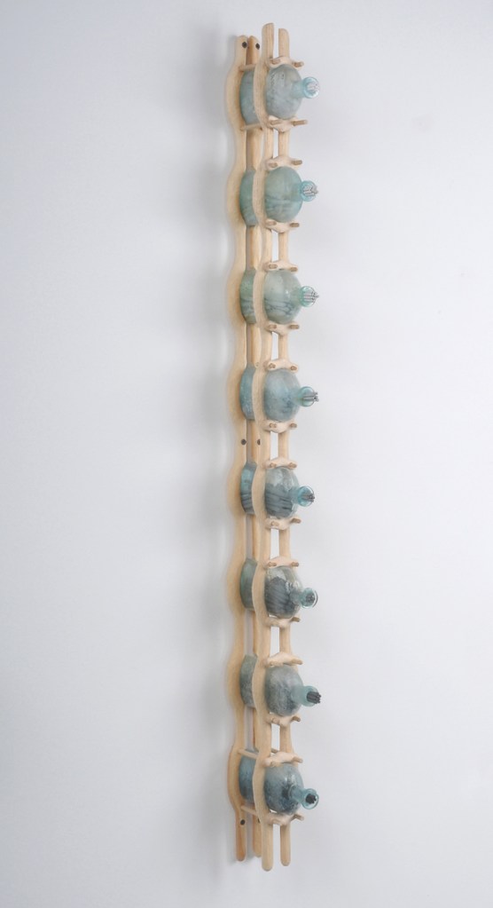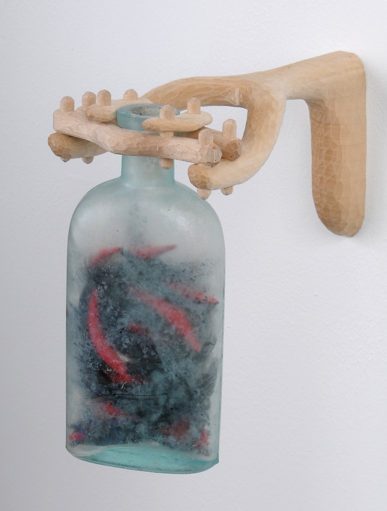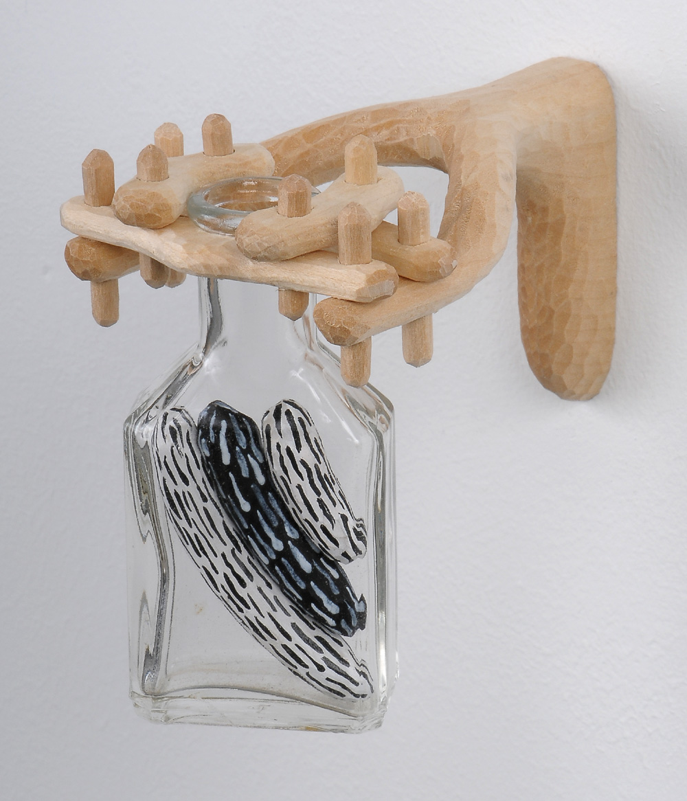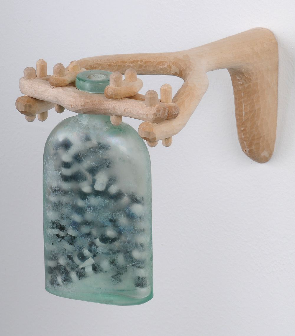Opalescent blue green bottles form the heart and soul of this new body of work. Dug from the banks of the Merrimac River and other metro Boston waterways by a scuba-diving urban archaeologist and then purged from a basement housing the collection, I have breathed new life into these twice resurrected vessels. Obsessively whittled wooden forms, enigmatic and evocative, replace the original Victorian elixirs. I have suspended the bottles on pegged and jointed contraptions suggestive of a 1950’s basement workshop merging with a medieval alchemist’s laboratory hinting at an unknowable but distinct purpose. These interventions stretch the definition of function and celebrate the quirkiness of the individual.