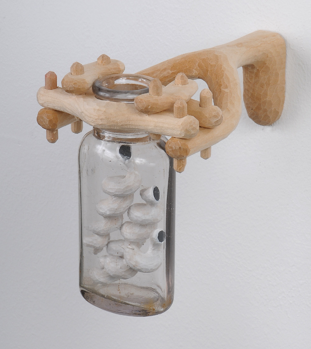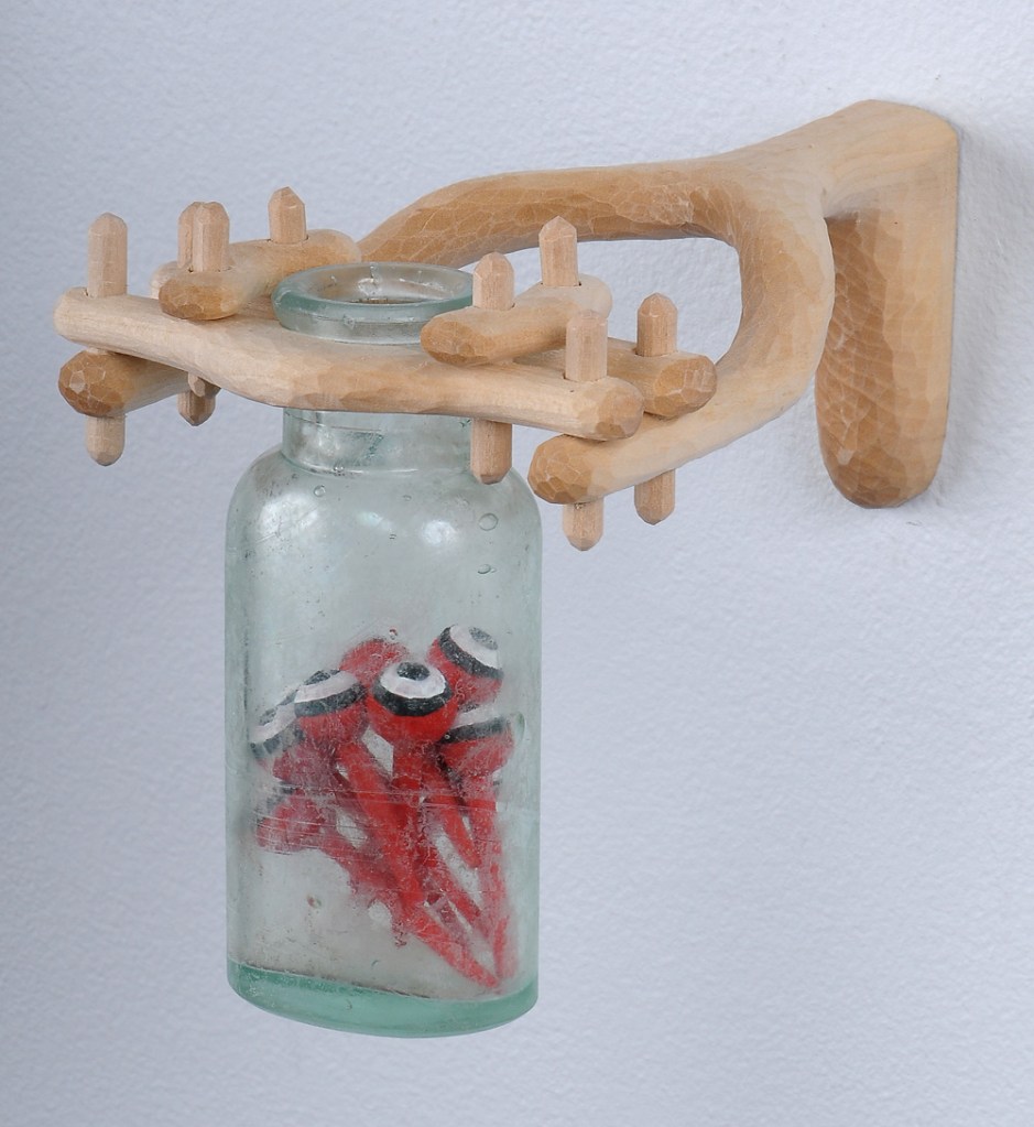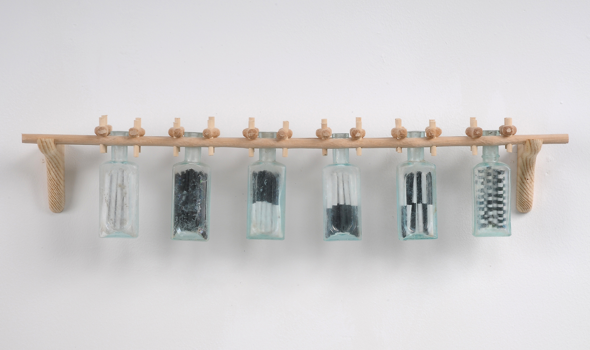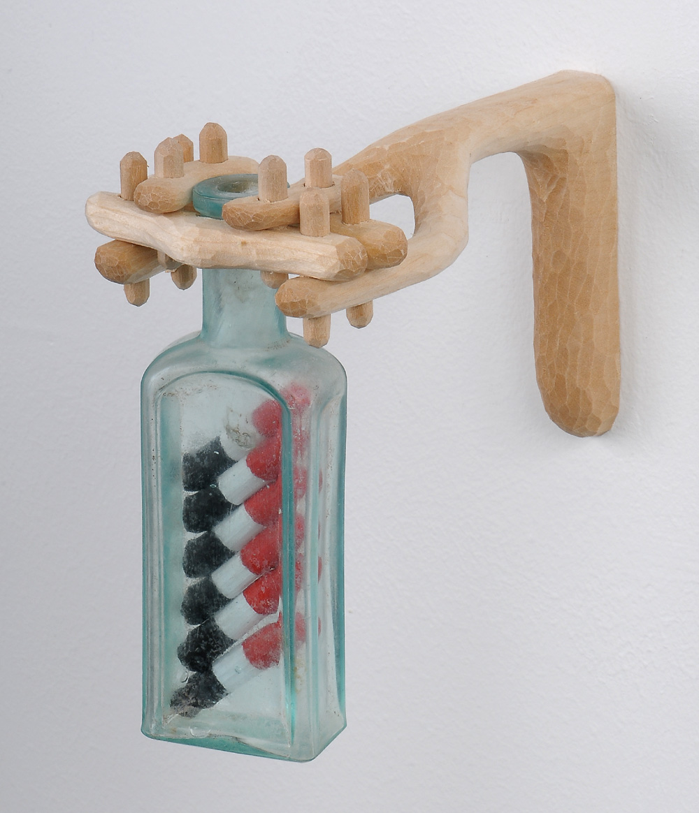 Opalescent blue green bottles form the heart and soul of this new body of work. Dug from the banks of the Merrimac River and other metro Boston waterways by a scuba-diving urban archaeologist and then purged from a basement housing the collection, I have breathed new life into these twice resurrected vessels. Obsessively whittled wooden forms, enigmatic and evocative, replace the original Victorian elixirs. I have suspended the bottles on pegged and jointed contraptions suggestive of a 1950’s basement workshop merging with a medieval alchemist’s laboratory hinting at an unknowable but distinct purpose. These interventions stretch the definition of function and celebrate the quirkiness of the individual.