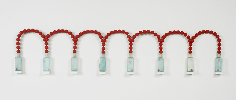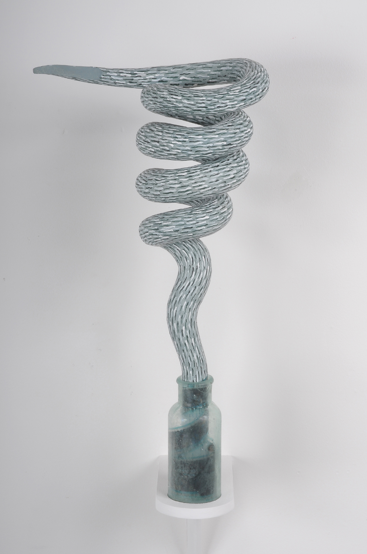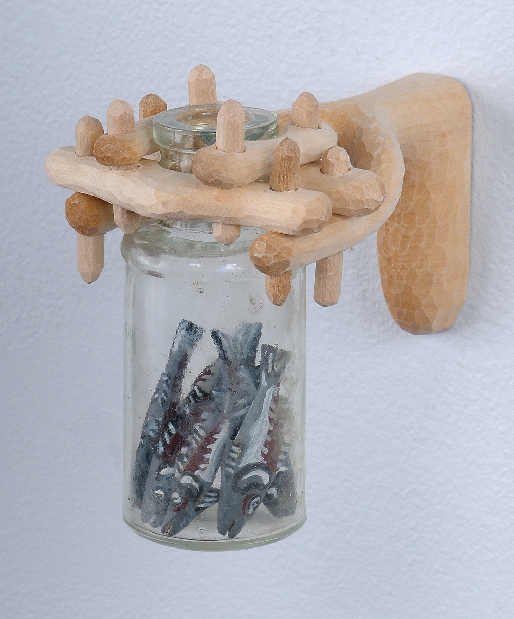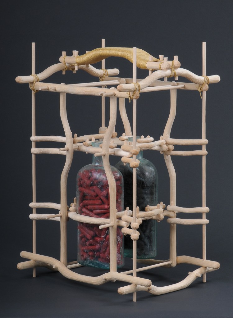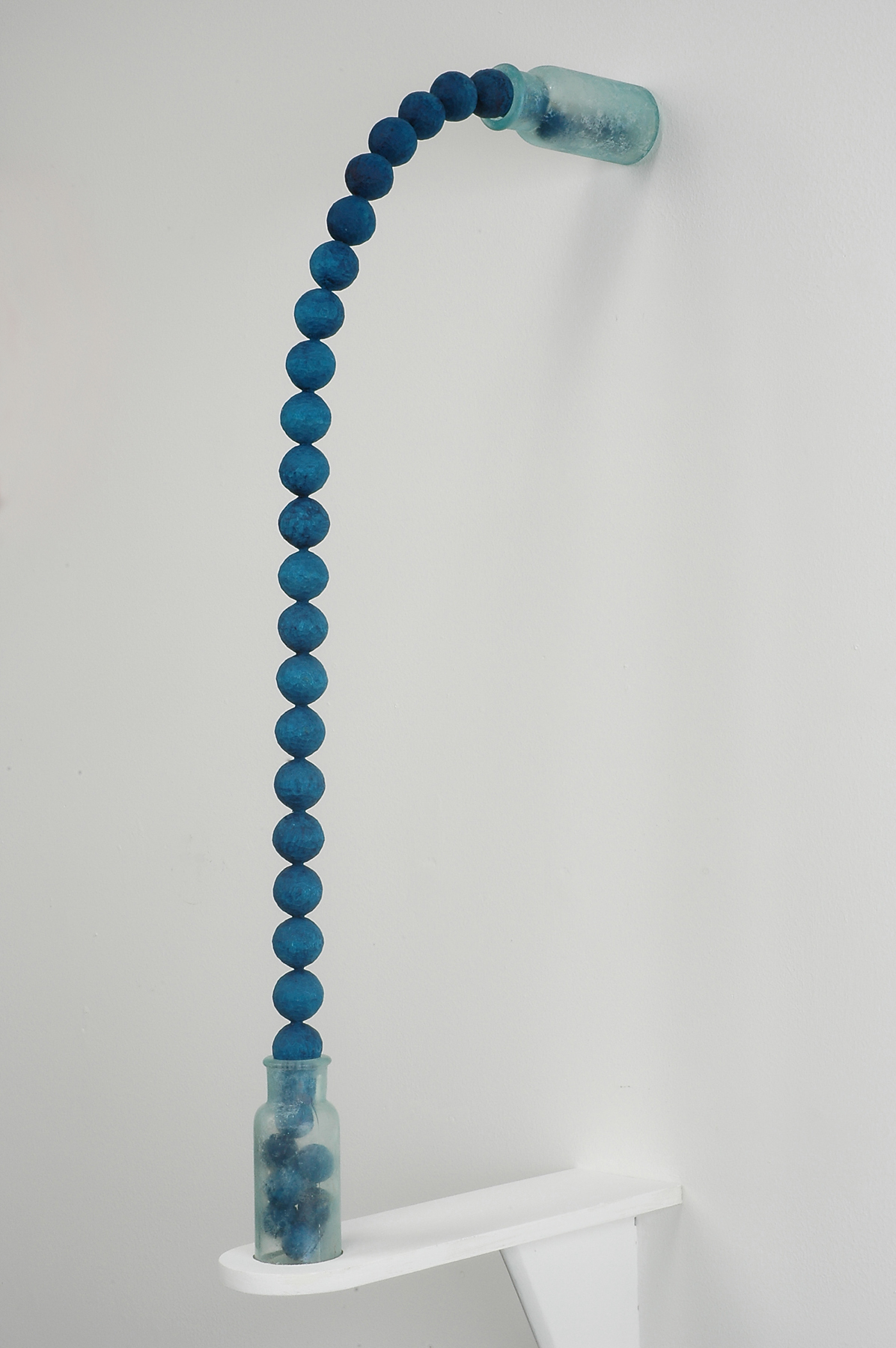 Opalescent blue green bottles form the heart and soul of this new body of work. Dug from the banks of the Merrimac River and other metro Boston waterways by a scuba-diving urban archaeologist and then purged from a basement housing the collection, I have breathed new life into these twice resurrected vessels. Obsessively whittled wooden forms, enigmatic and evocative, replace the original Victorian elixirs. I have suspended the bottles on pegged and jointed contraptions suggestive of a 1950’s basement workshop merging with a medieval alchemist’s laboratory hinting at an unknowable but distinct purpose. These interventions stretch the definition of function and celebrate the quirkiness of the individual.