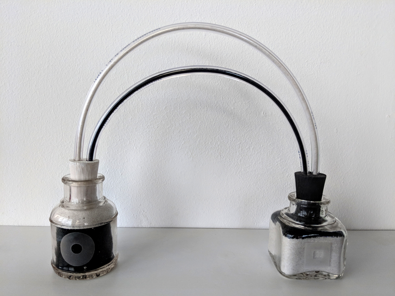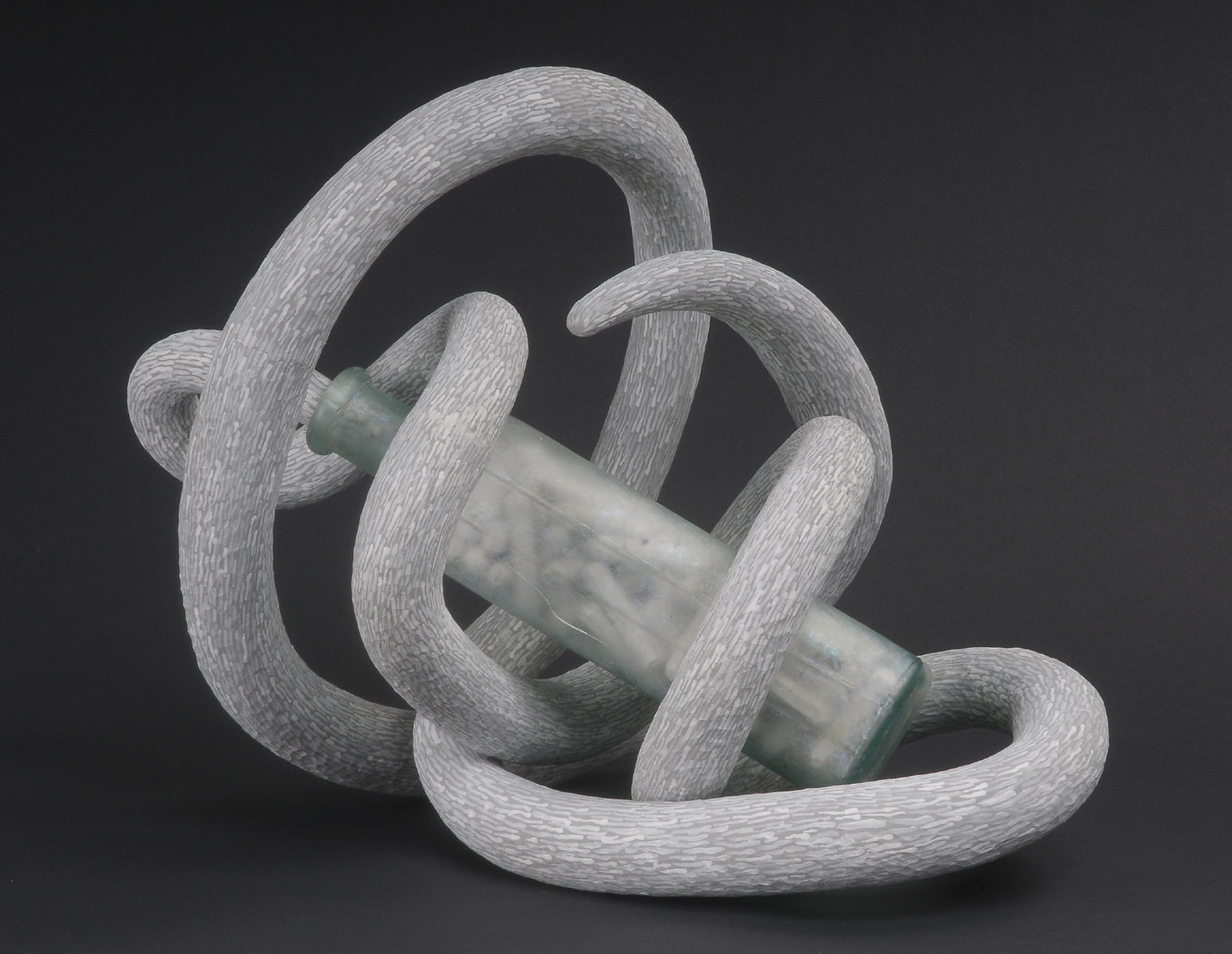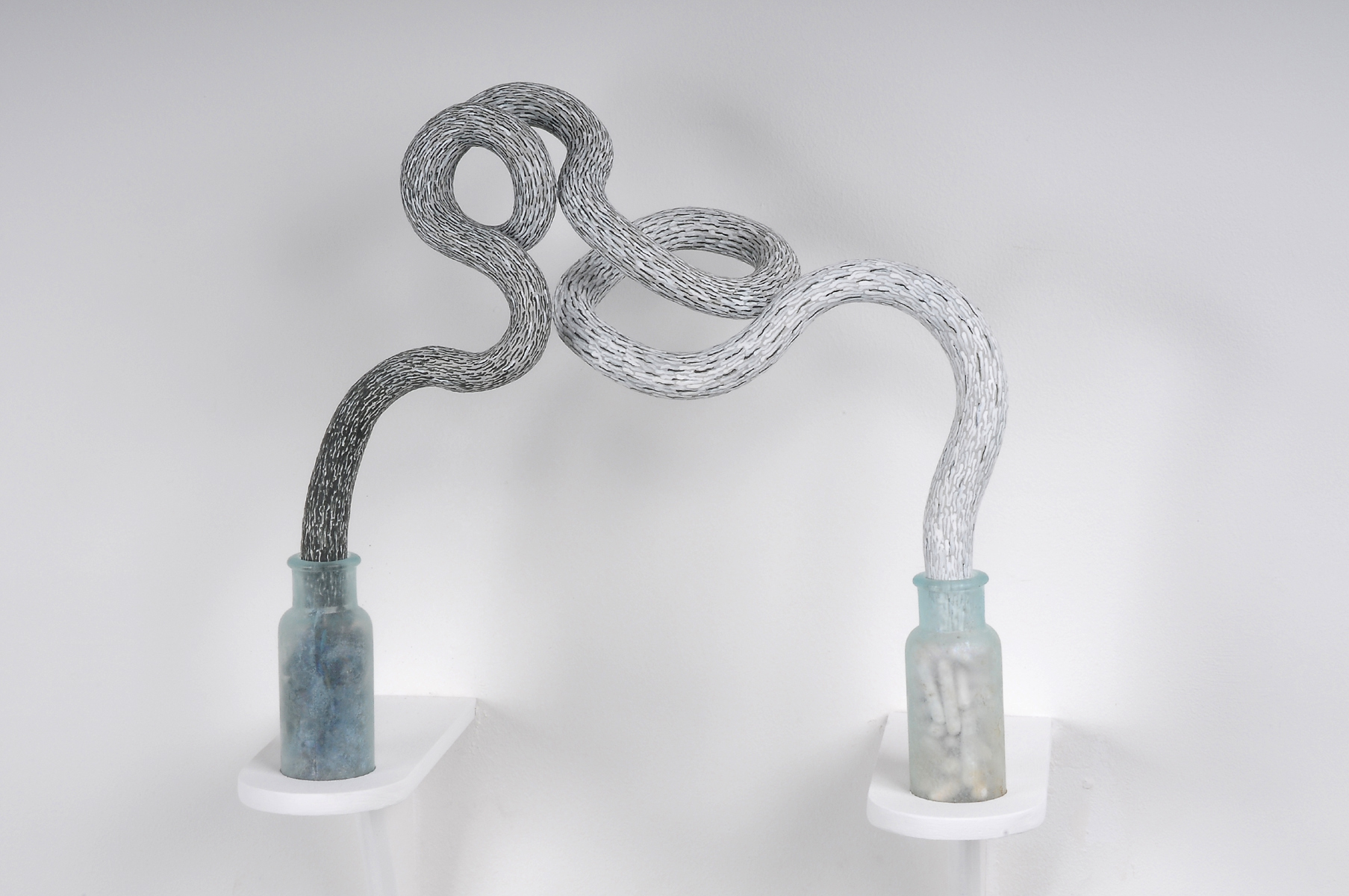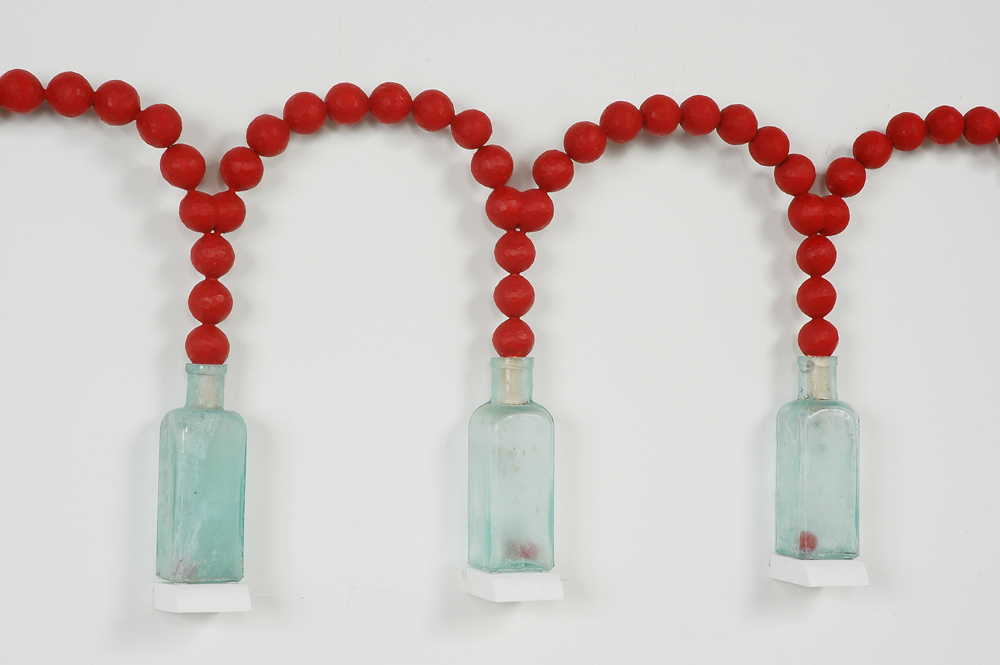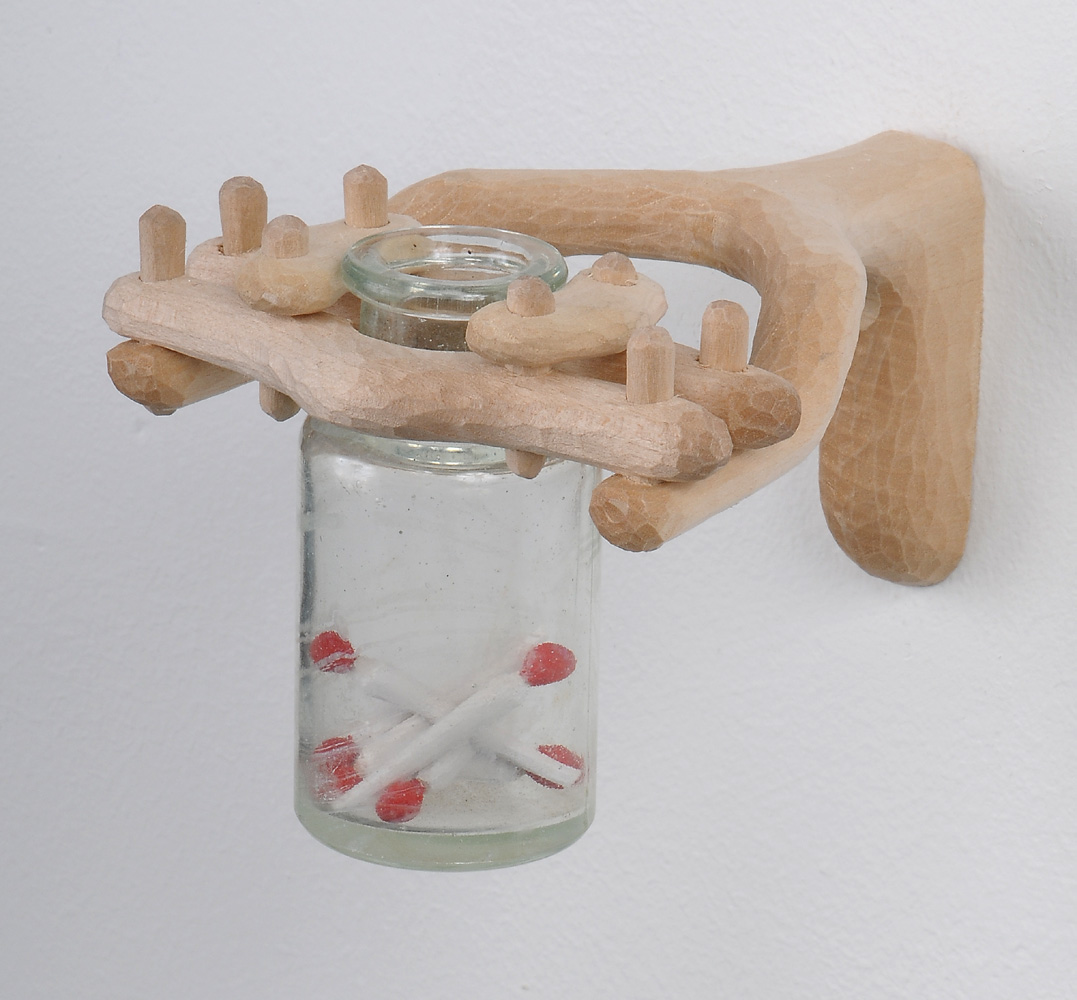 Opalescent blue green bottles form the heart and soul of this new body of work. Dug from the banks of the Merrimac River and other metro Boston waterways by a scuba-diving urban archaeologist and then purged from a basement housing the collection, I have breathed new life into these twice resurrected vessels. Obsessively whittled wooden forms, enigmatic and evocative, replace the original Victorian elixirs. I have suspended the bottles on pegged and jointed contraptions suggestive of a 1950’s basement workshop merging with a medieval alchemist’s laboratory hinting at an unknowable but distinct purpose. These interventions stretch the definition of function and celebrate the quirkiness of the individual.