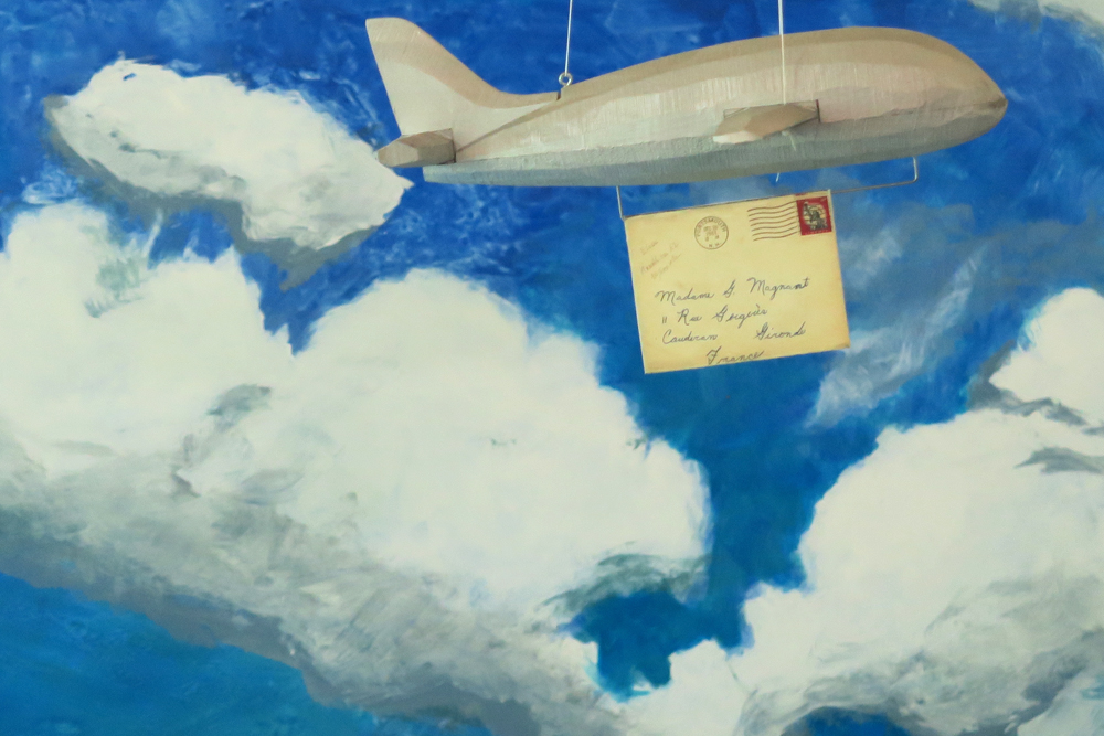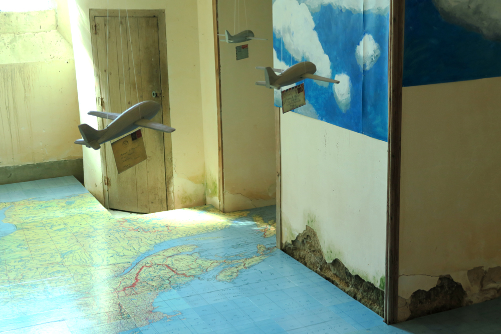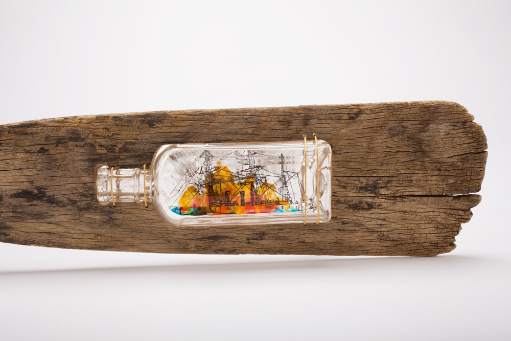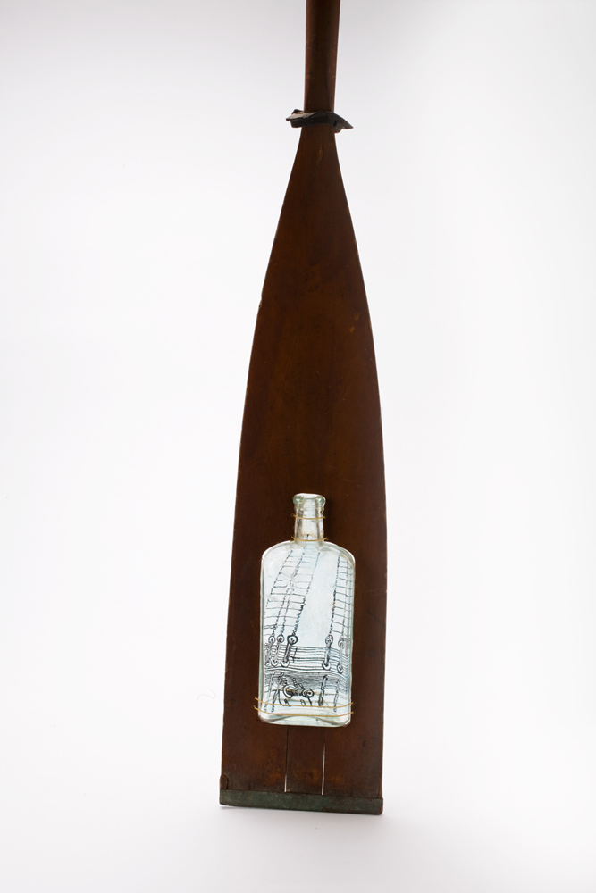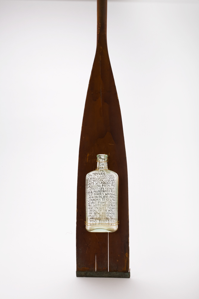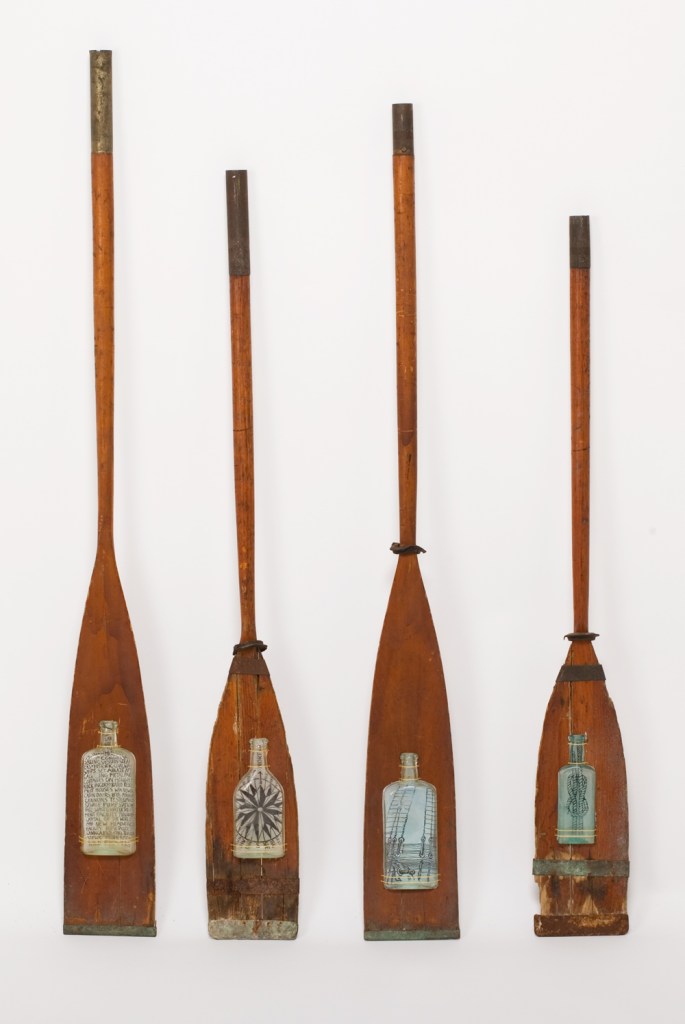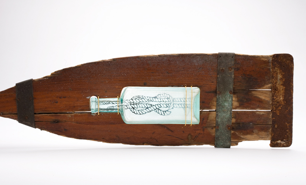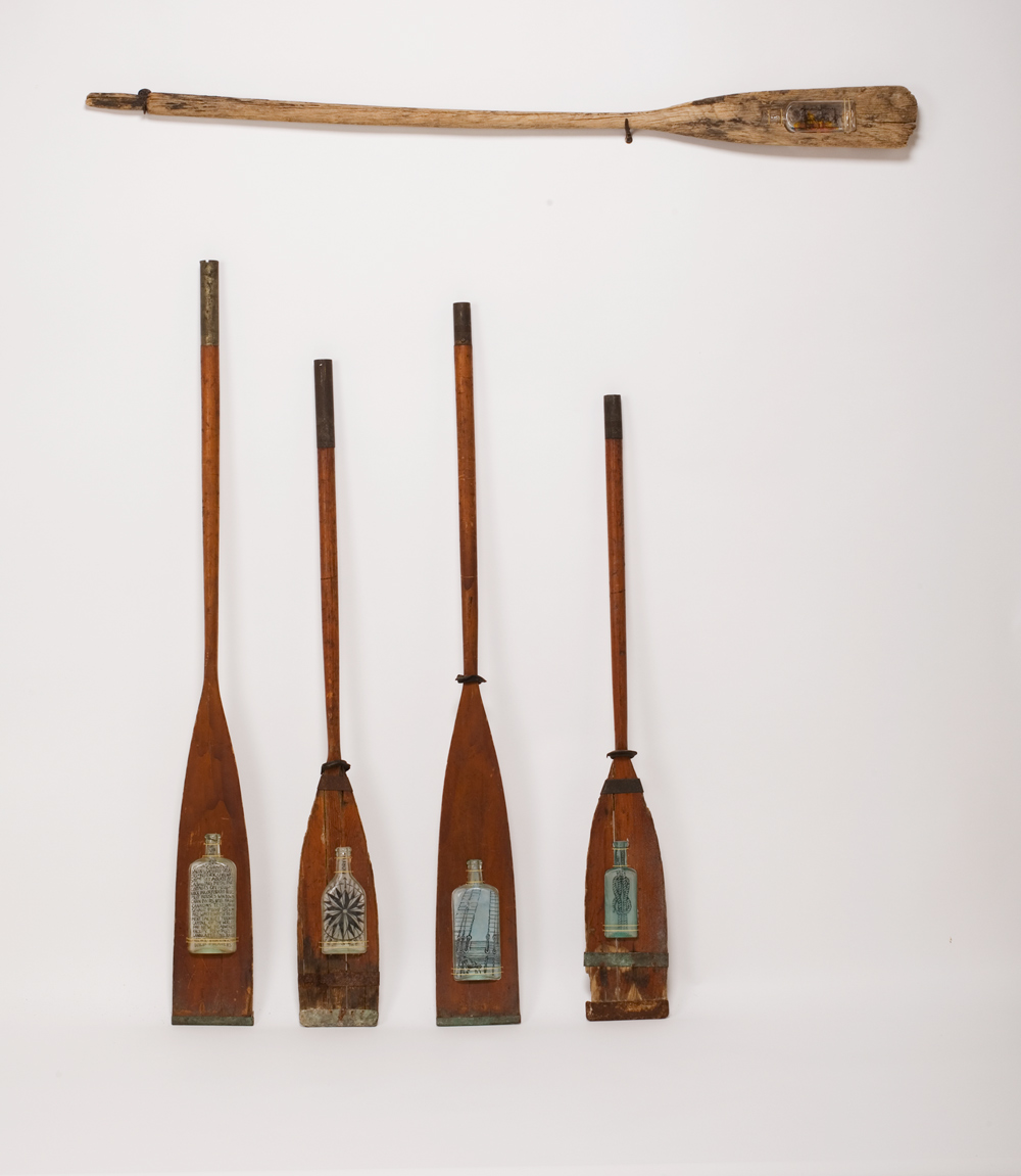Jessica Straus’s and Antoinette Winters’s collaborative installation, “The Beaching”, presents five oars with inset bottles suggesting jetsam found on the shore. Each bottle holds an image–or memory–of the history of Nut Island: a ship ablaze, a sailor’s rope, a ship’s compass, and a close-up of a frigate. A fifth image is text, a condensed, chronological account of this history. In keeping with Straus’s and Winters’s interest in the period of the decommissioned ships and their desire to honor and reference the lesser known facts of the island, they chose to further strengthen the nautical reference by embedding the drawings in found bottles from the 19th century, which had been excavated from the urban waterways around Boston.