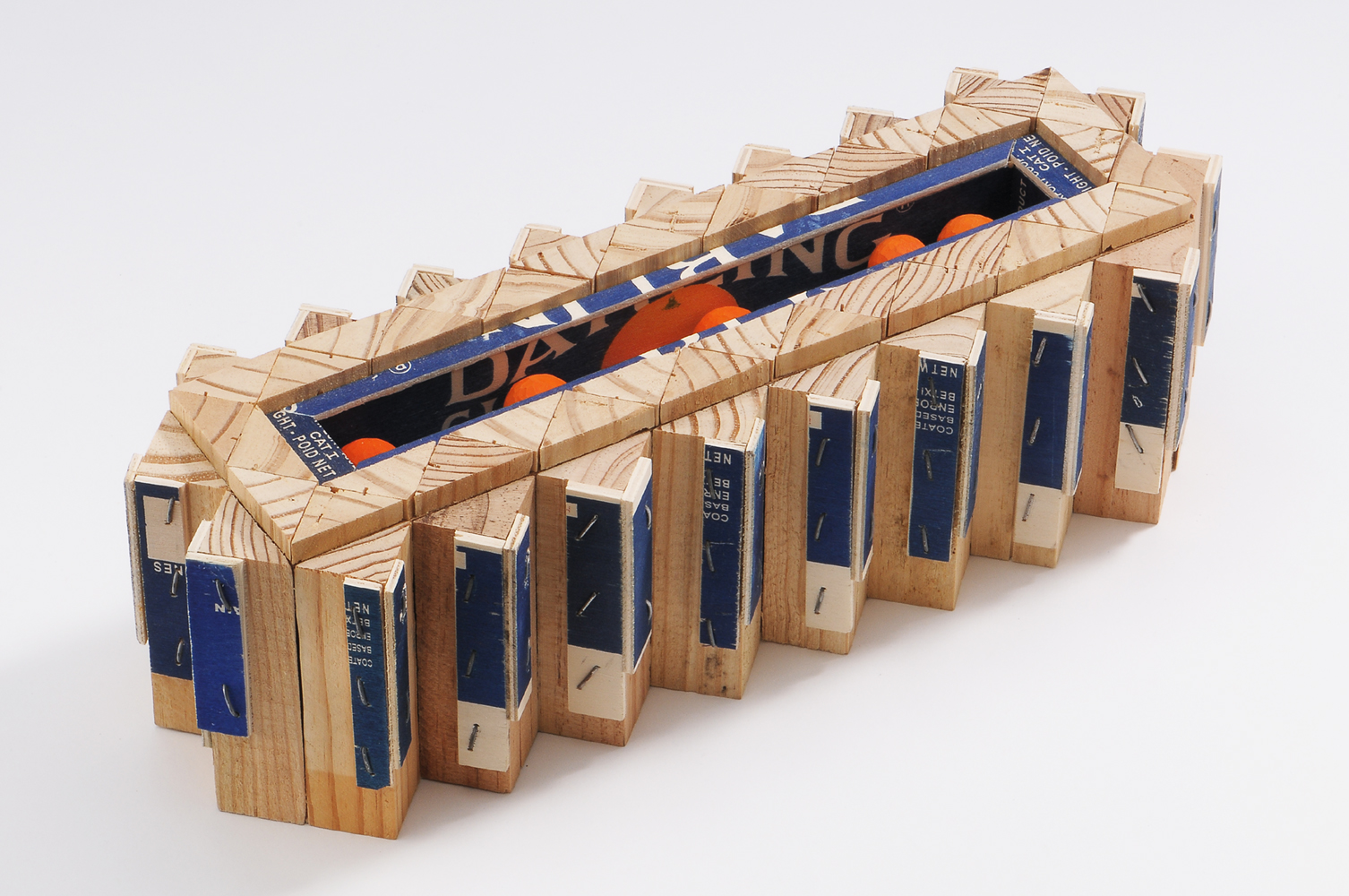For years, the highest compliment my son could pay a friend of ours went something like this: “In a Zombie apocalypse I’m going to choose Kevin (or Jon, or Brian) to be one of the four people I hole up with.” The chosen one would provide invaluable skills and traits, such as keen intelligence, calmness under pressure, cleverness with mechanical things, psychological insight, and above all, creative, out-of-the box thinking. I didn’t want to press the issue too hard (hey, what about me? I’m a good out-of-the-box thinker!), but I wasn’t ever sure I would be selected for the bunker. Then one day my son burst out with “Forget Zombies! What if we were blown back to the Stone Age: what skills do we have that would help us survive?” Suddenly his computer skills weren’t so hot anymore and my prospects were looking better! I’ve always thought one of my best abilities was in jury rigging, making something out of nothing, coming up with endless possibilities with very few resources. Thus I present “Scrap!” a compilation of potentially useful (or maybe not) inventions made entirely of clementine crates. I think we’ll be able to scrounge for those in our post-apocalyptic world, in my basement, in your basement, in dumpsters here and there. We’ll be ready.