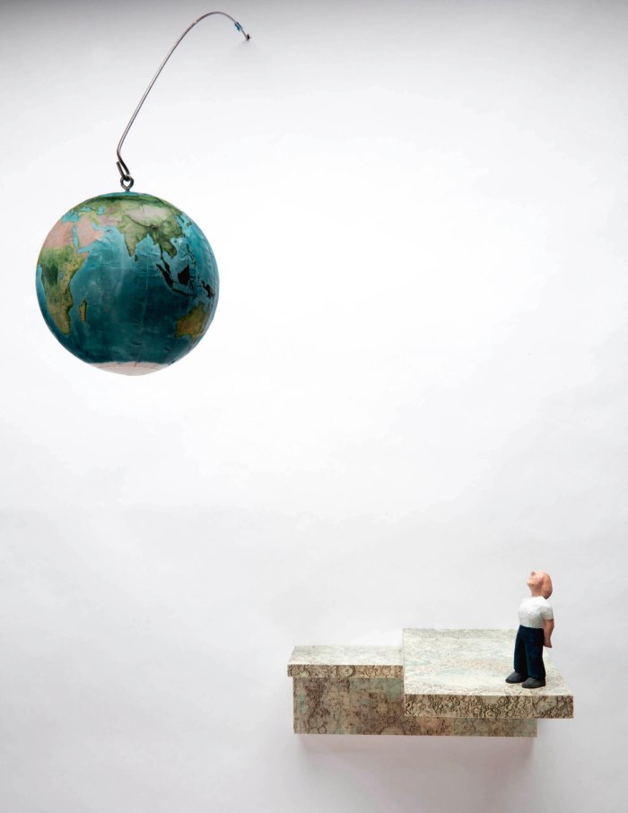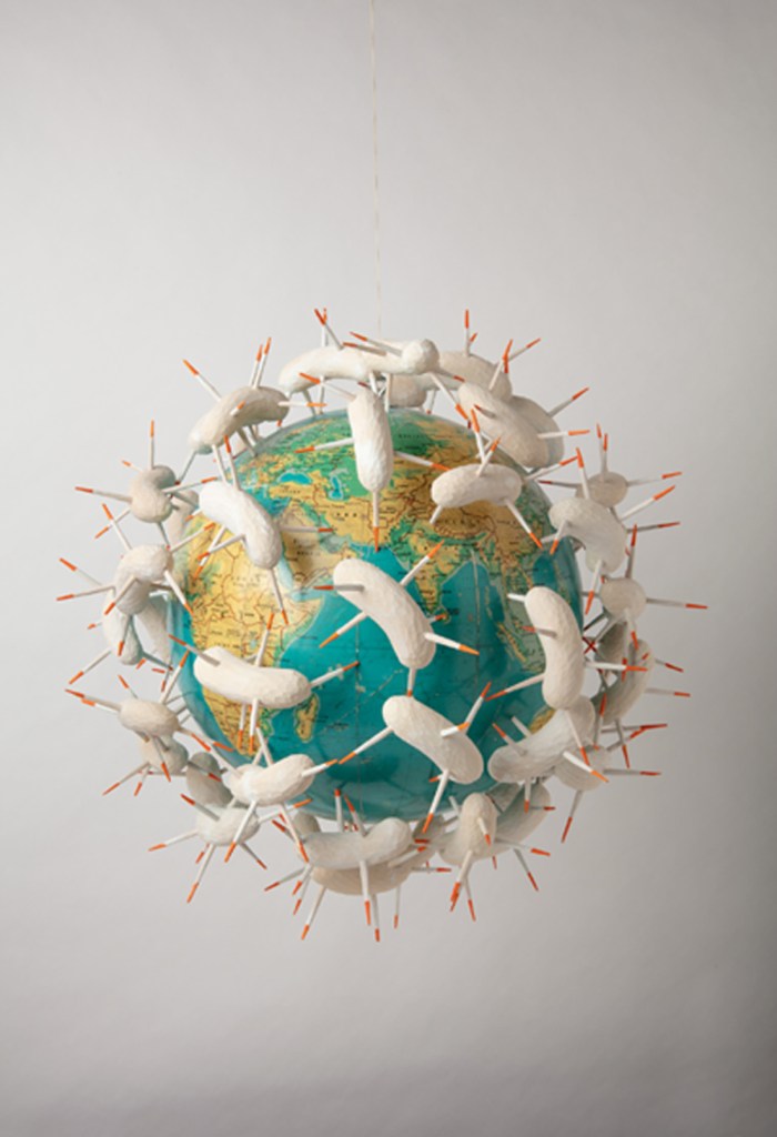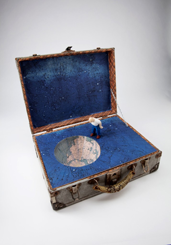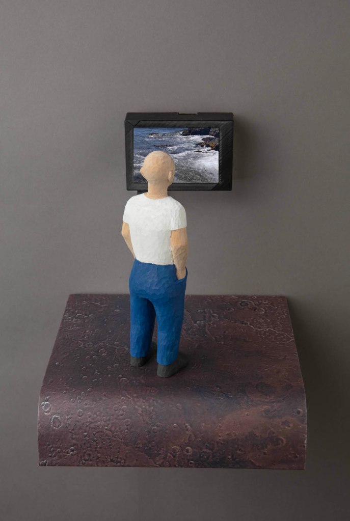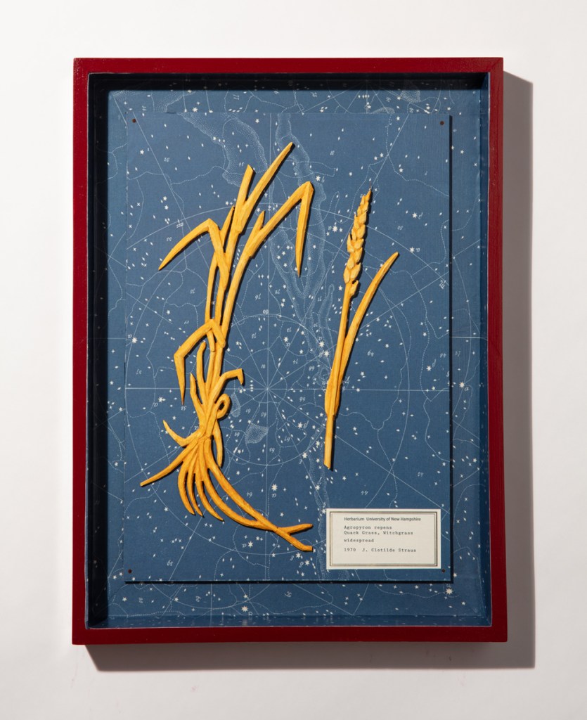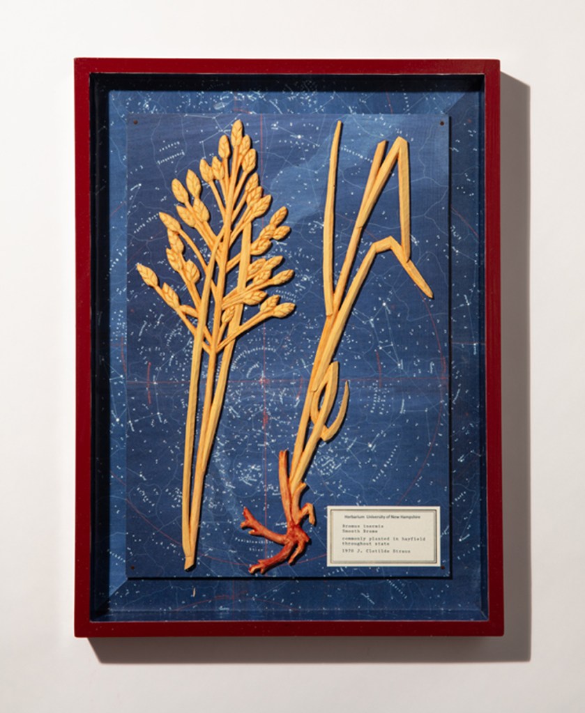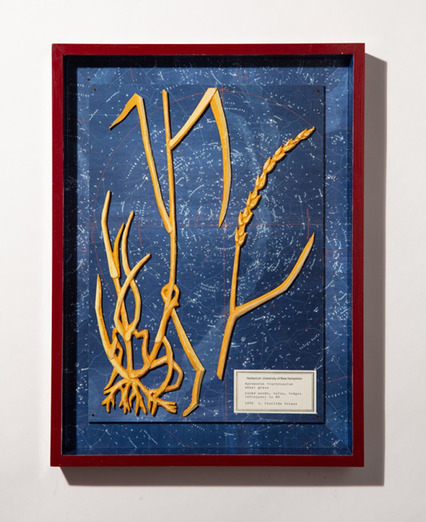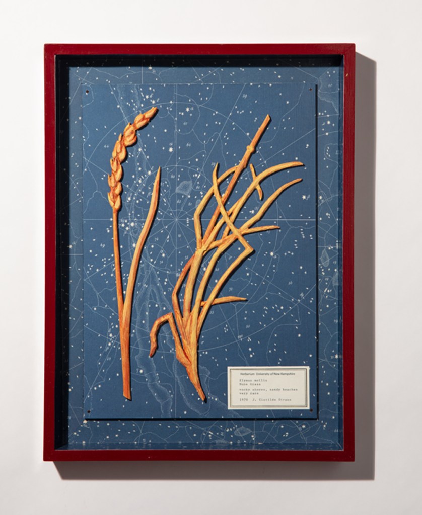 Black humor, longing, and regret are at play in Jessica Straus’s exhibition Packing for Mars. Straus looks forward with dread to a future when humans must flee a devastated Earth to settle on far flung, arid worlds. Yet, the artist is not packing gear for survival in a desolate landscape but, rather, offering poignant reminders of what has been left behind. Masterfully carved wooden figures stand-in for everyman and everywoman as they gaze longingly earthward from the moon, Mars and the star fields. Fragile hand-sewn earth spheres reveal vulnerability in their delicate stitching. In a particularly poignant series, Straus whittles plant specimens from her native New Hampshire, transforming them from humble grasses into botanical treasures. Packing for Mars looks both backward and forward in time, as we each contemplate the preciousness of the environment we love and on which we all depend.