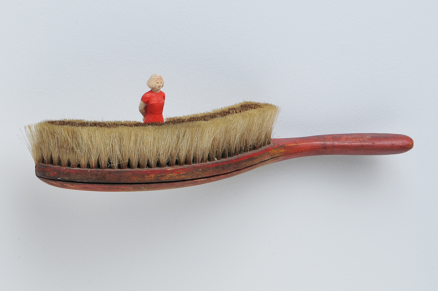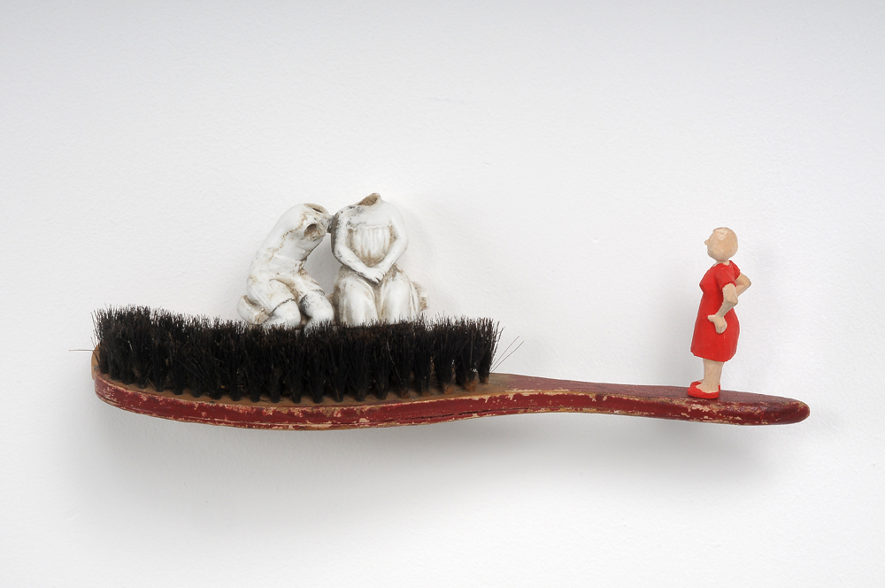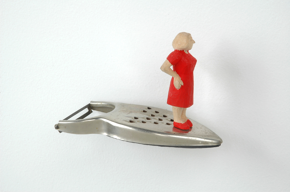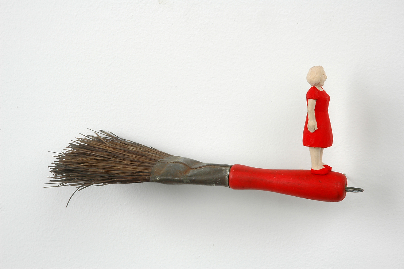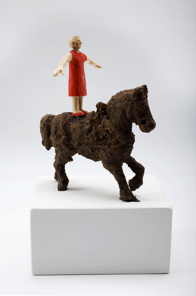 Small carved female figures, stoically poised in various precarious positions on found objects, leave the viewer at once alarmed and chuckling in self recognition. As in all of Straus’s work, the line between levity and gravity is crossed and re-crossed, and held in delicate balance.