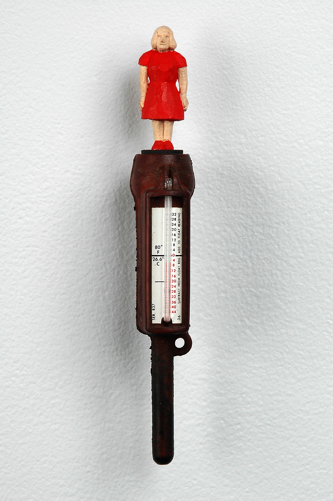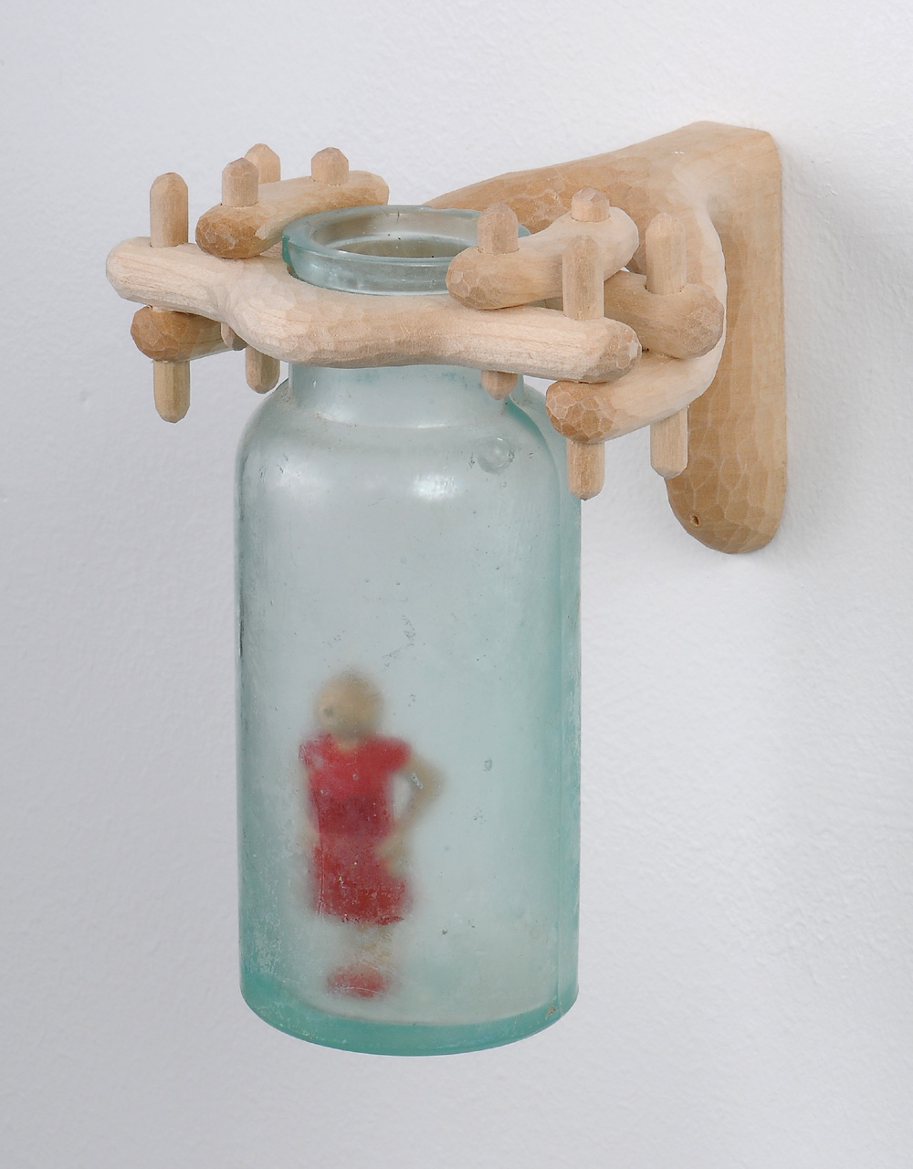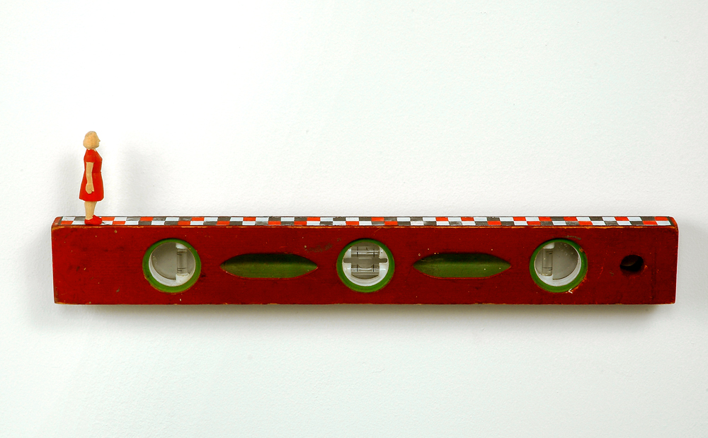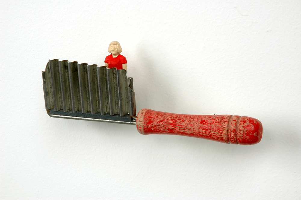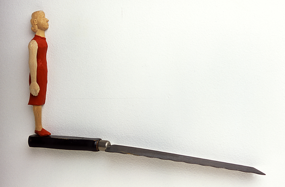 Small carved female figures, stoically poised in various precarious positions on found objects, leave the viewer at once alarmed and chuckling in self recognition. As in all of Straus’s work, the line between levity and gravity is crossed and re-crossed, and held in delicate balance.
