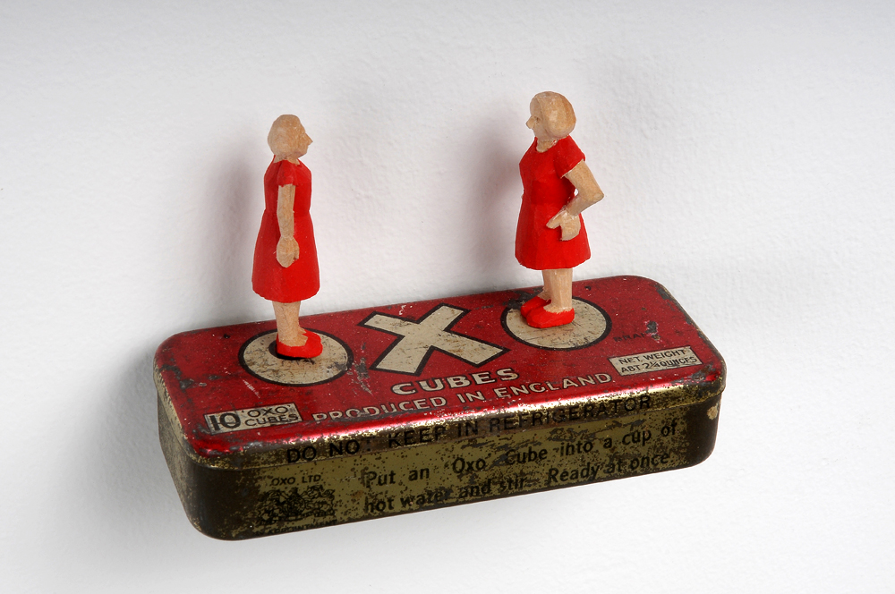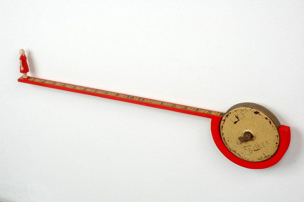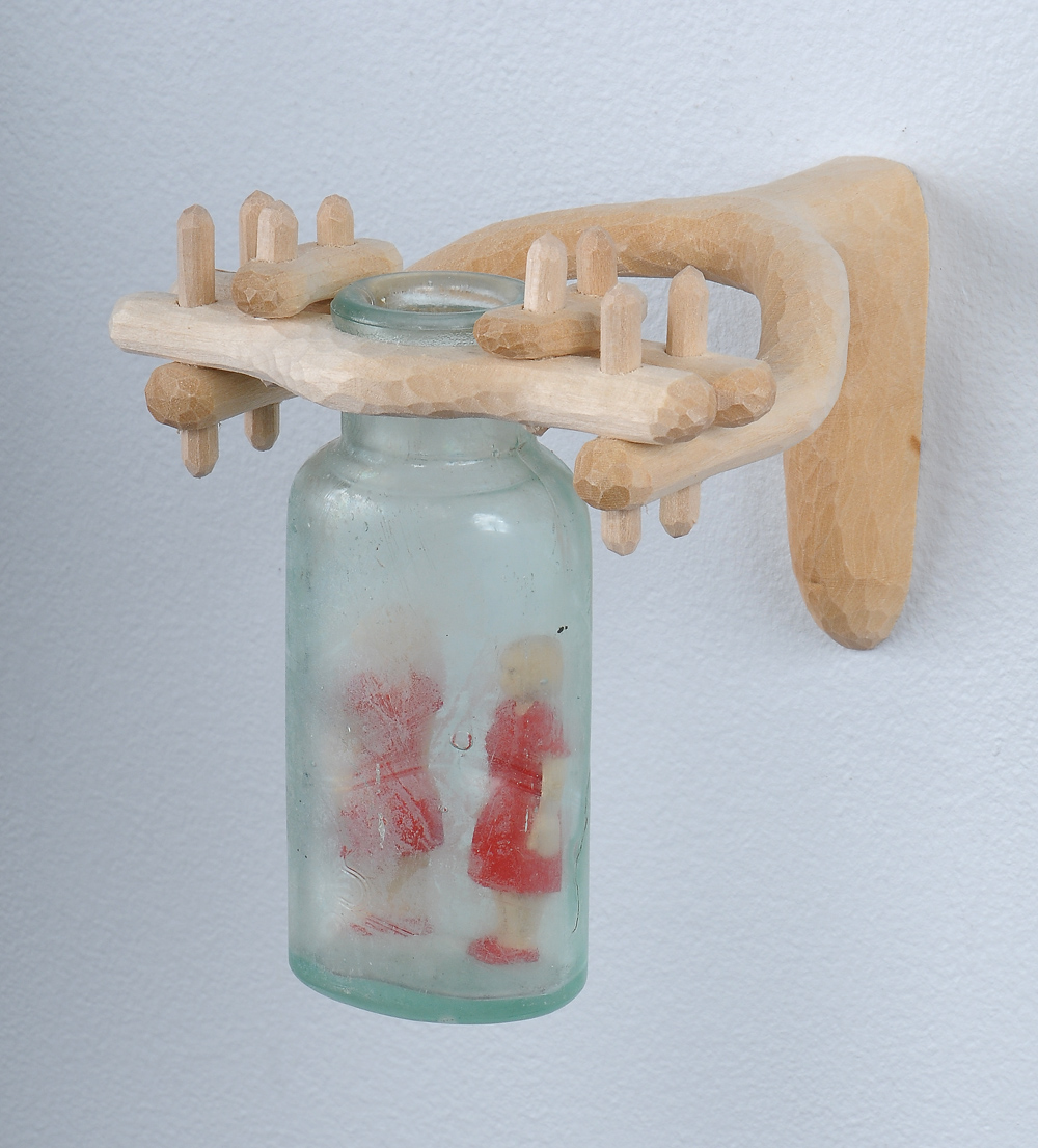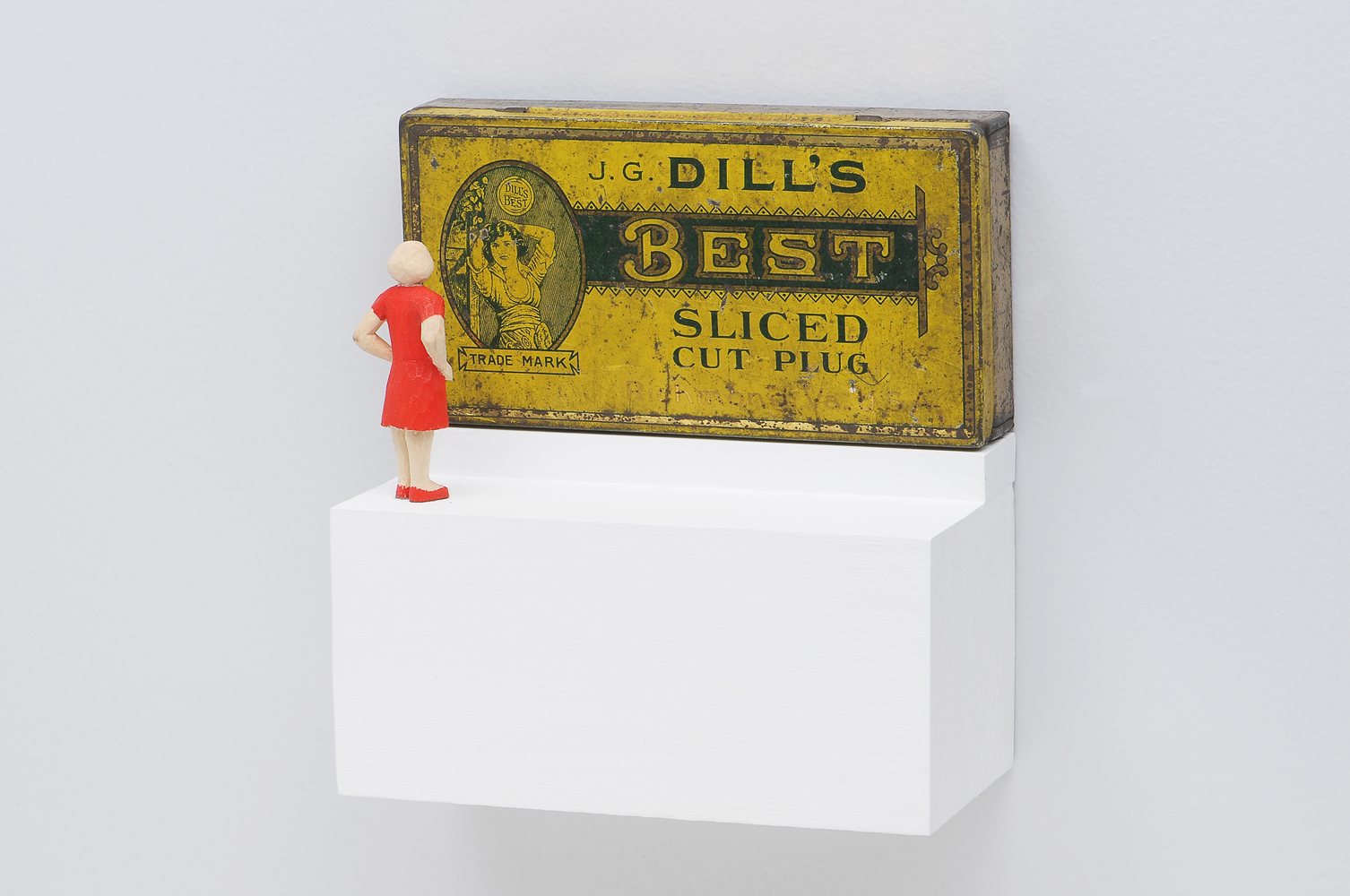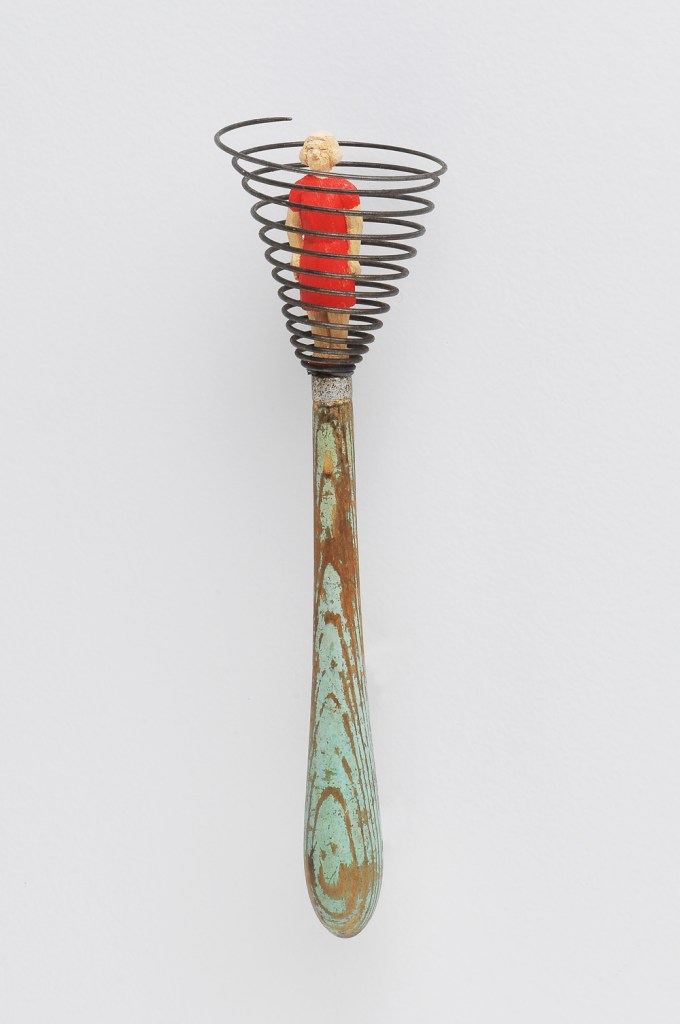 Small carved female figures, stoically poised in various precarious positions on found objects, leave the viewer at once alarmed and chuckling in self recognition. As in all of Straus’s work, the line between levity and gravity is crossed and re-crossed, and held in delicate balance.