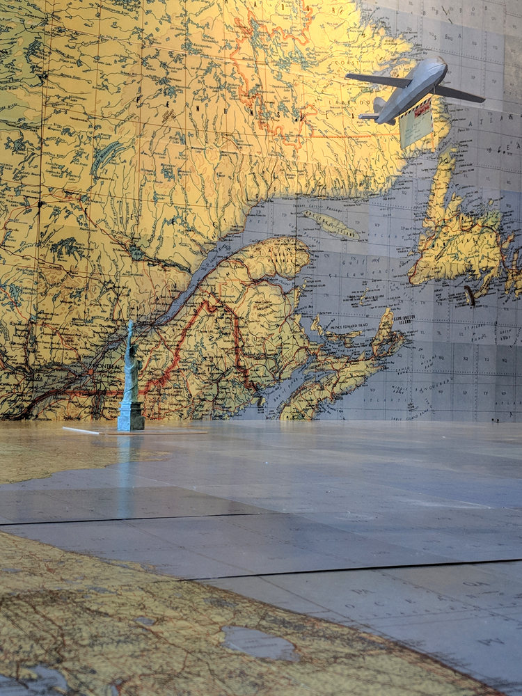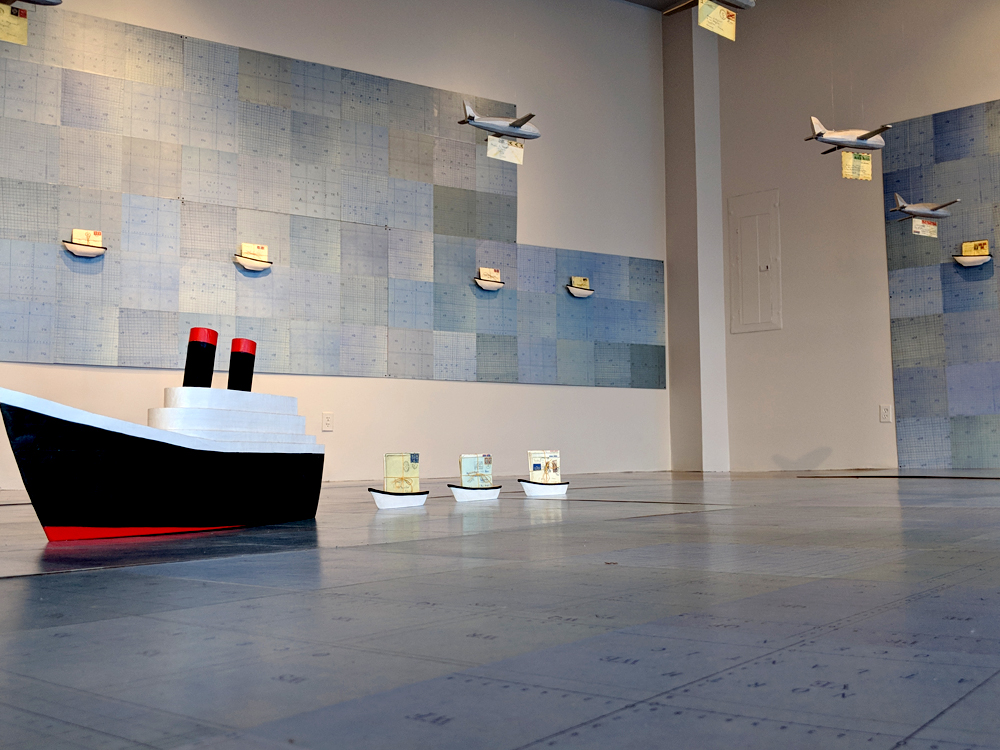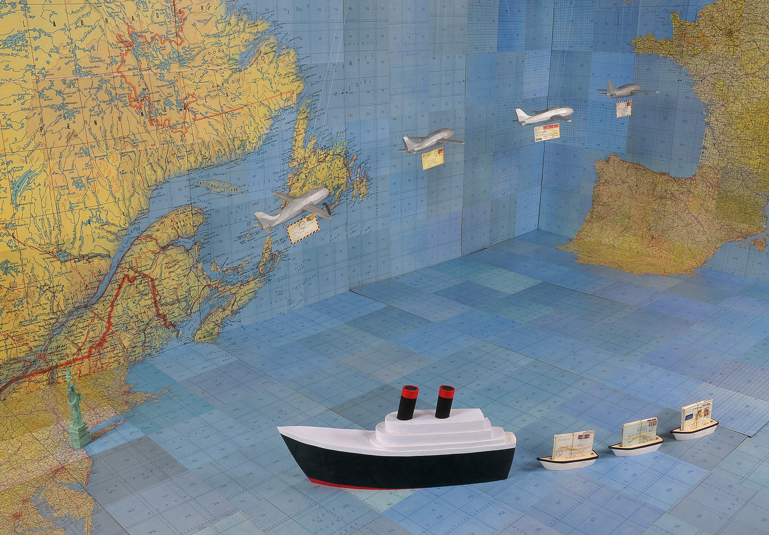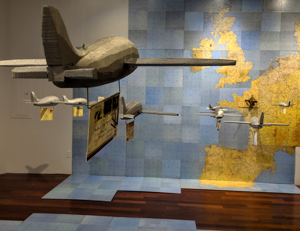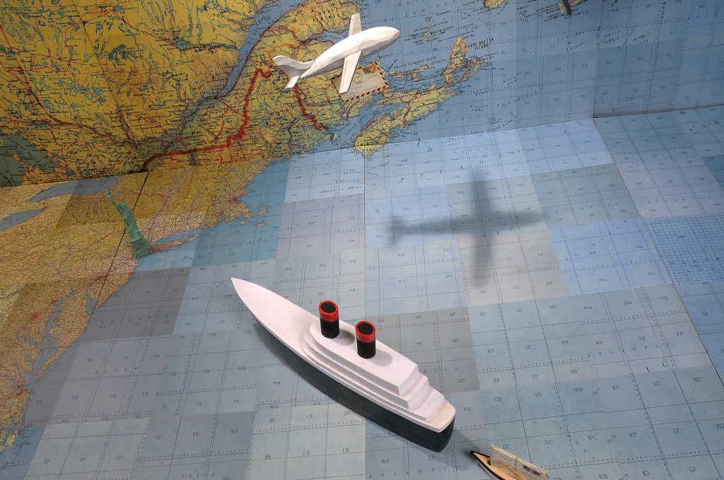 Jessica Straus’s exhibition, “TransAtlantic”, travels to Boston Sculptors Gallery after its initial showing in France. Originally commissioned to fill the space of “Le Temple Protestant” in the village of Athis de L’Orne, located in a region of Normandy that was heavily bombarded during World War II, Straus’s installation commemorates the long and strong alliance between France and the United States. Straus’s installation is both political and personal. Her parents met as a result of her American father’s participation as a soldier in the Normandy invasion and subsequent march into Paris, where he met the artist’s mother, a French student. For this installation at Boston Sculptors Gallery, the walls and floor will be clad in a room-sized World War II era map. A fleet of airplanes and ocean liner criss-cross the Atlantic Ocean carrying correspondence between the artist’s American and French families. Straus conceived of this work just as the current administration was coming into power. The new era of xenophobia and nationalistic supremacy that has been ushered in has been alarming, to say the least. The sculptural installation “TransAtlantic” serves as a reminder of the importance of alliances between nations and the possibilities that surface with openness to strangers.