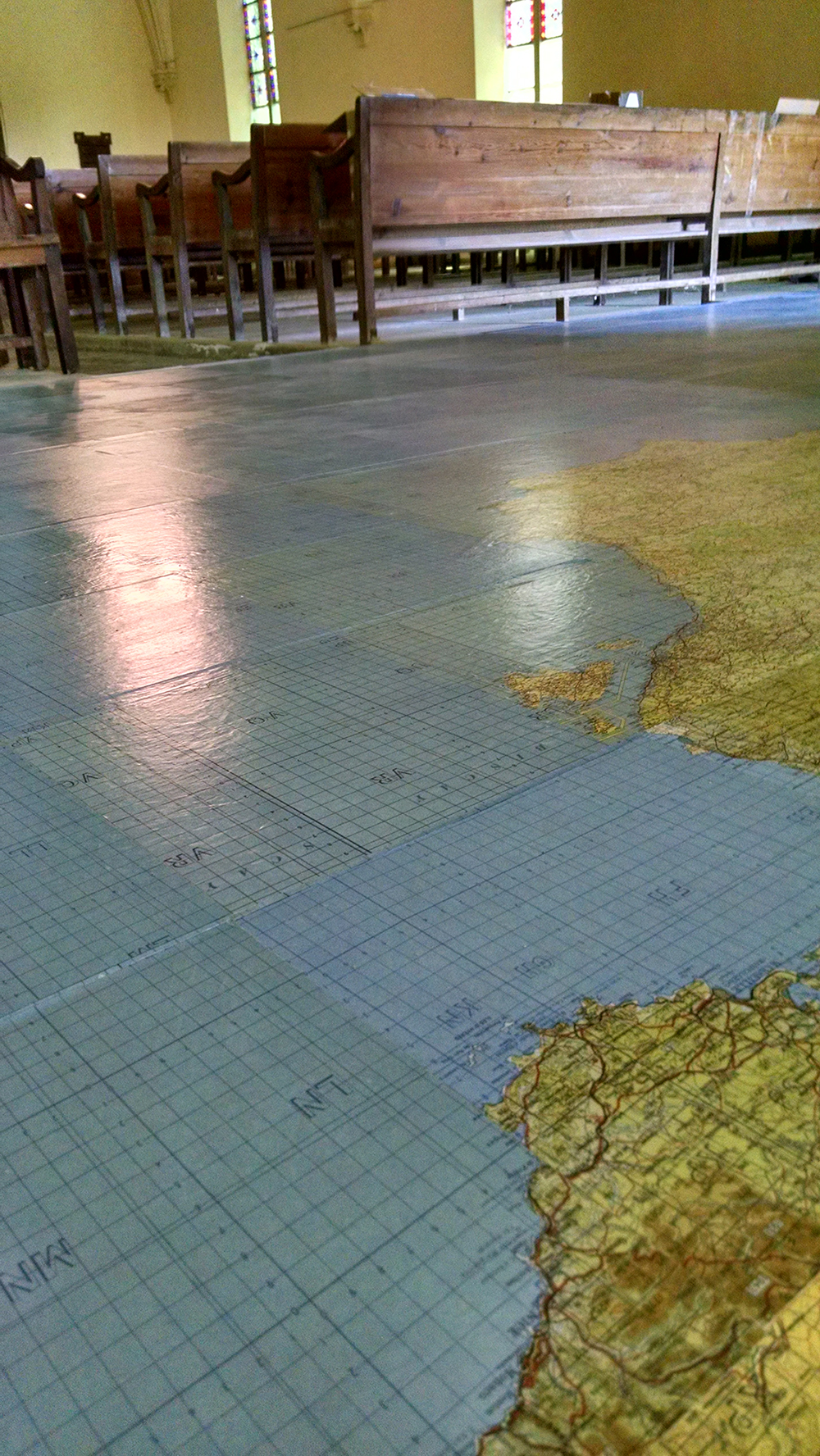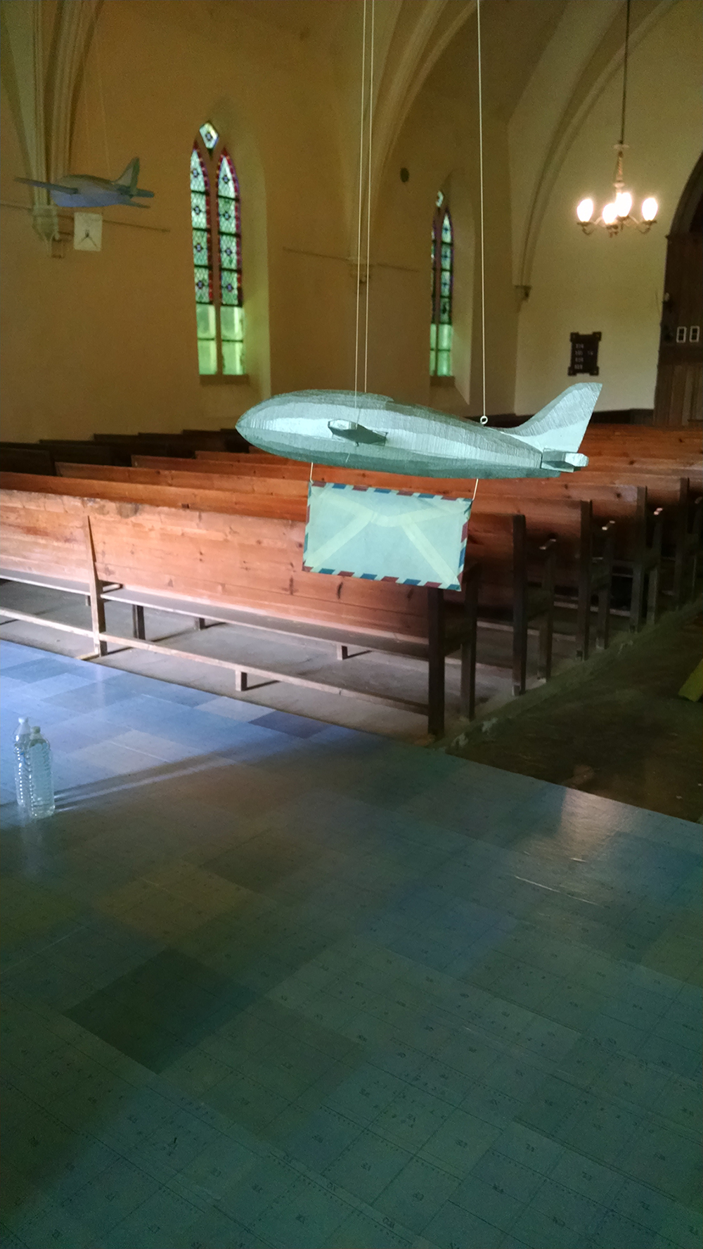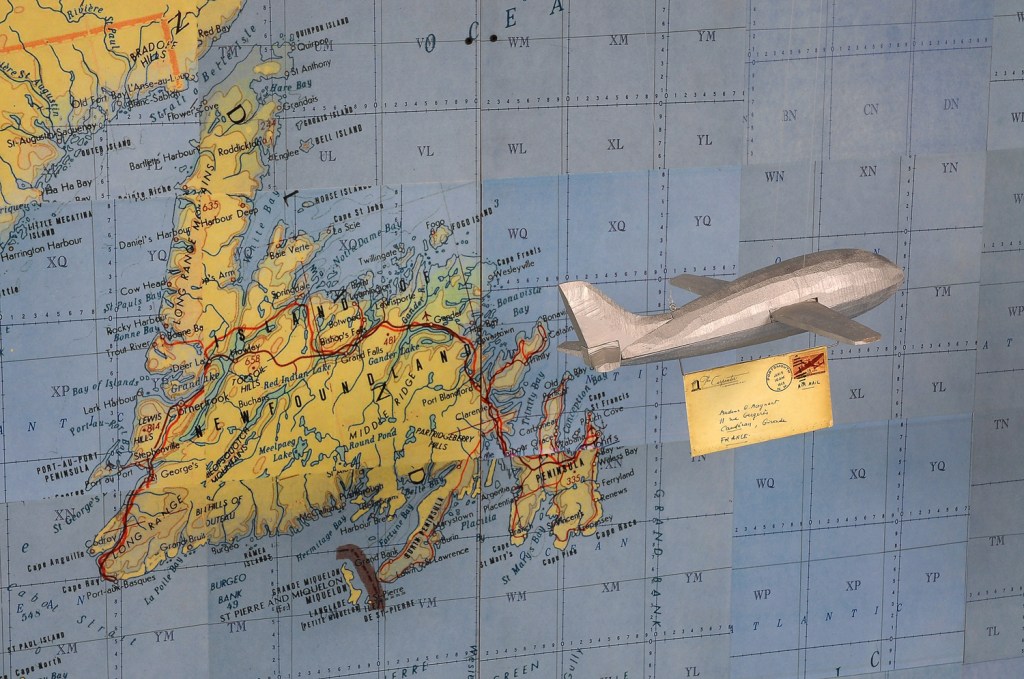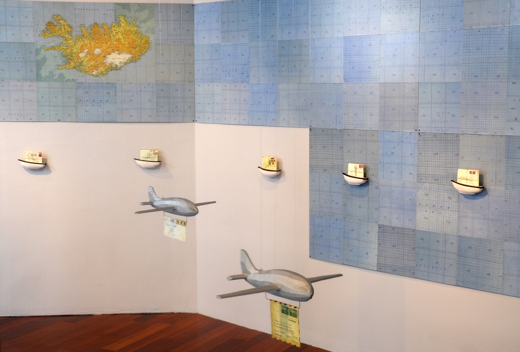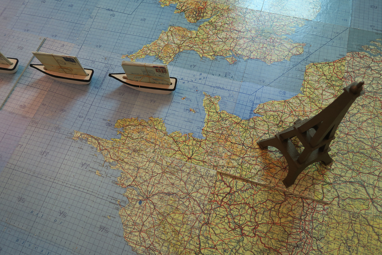 Jessica Straus’s exhibition, “TransAtlantic”, travels to Boston Sculptors Gallery after its initial showing in France. Originally commissioned to fill the space of “Le Temple Protestant” in the village of Athis de L’Orne, located in a region of Normandy that was heavily bombarded during World War II, Straus’s installation commemorates the long and strong alliance between France and the United States. Straus’s installation is both political and personal. Her parents met as a result of her American father’s participation as a soldier in the Normandy invasion and subsequent march into Paris, where he met the artist’s mother, a French student. For this installation at Boston Sculptors Gallery, the walls and floor will be clad in a room-sized World War II era map. A fleet of airplanes and ocean liner criss-cross the Atlantic Ocean carrying correspondence between the artist’s American and French families. Straus conceived of this work just as the current administration was coming into power. The new era of xenophobia and nationalistic supremacy that has been ushered in has been alarming, to say the least. The sculptural installation “TransAtlantic” serves as a reminder of the importance of alliances between nations and the possibilities that surface with openness to strangers.
